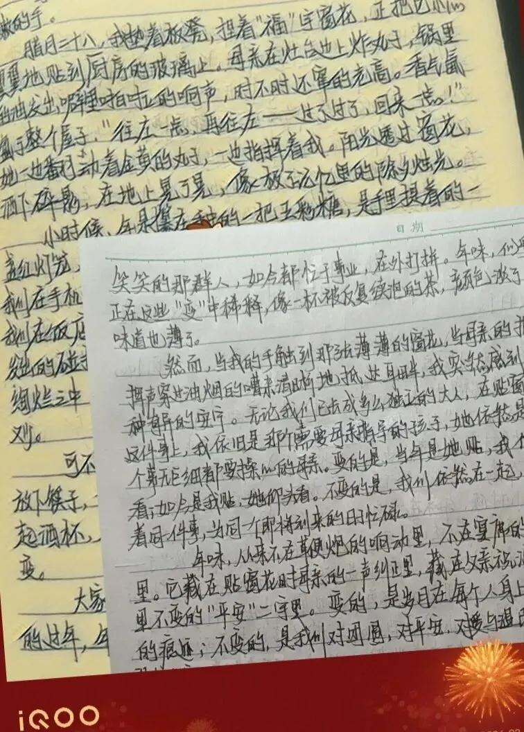 年味,是血脉里相连的陪伴与温情。当年,是母亲站在板凳上贴窗花,我仰着头帮她递胶带;如今,是我踩着板凳,母亲在一旁仰头把关。时光互换了彼此的位置,却从未冲淡那份陪伴。窗外的烟花或许少了,但当零星火光升起时,一家人依旧会放下筷子,并肩望向夜空,那一刻的沉默,胜过长篇大论。