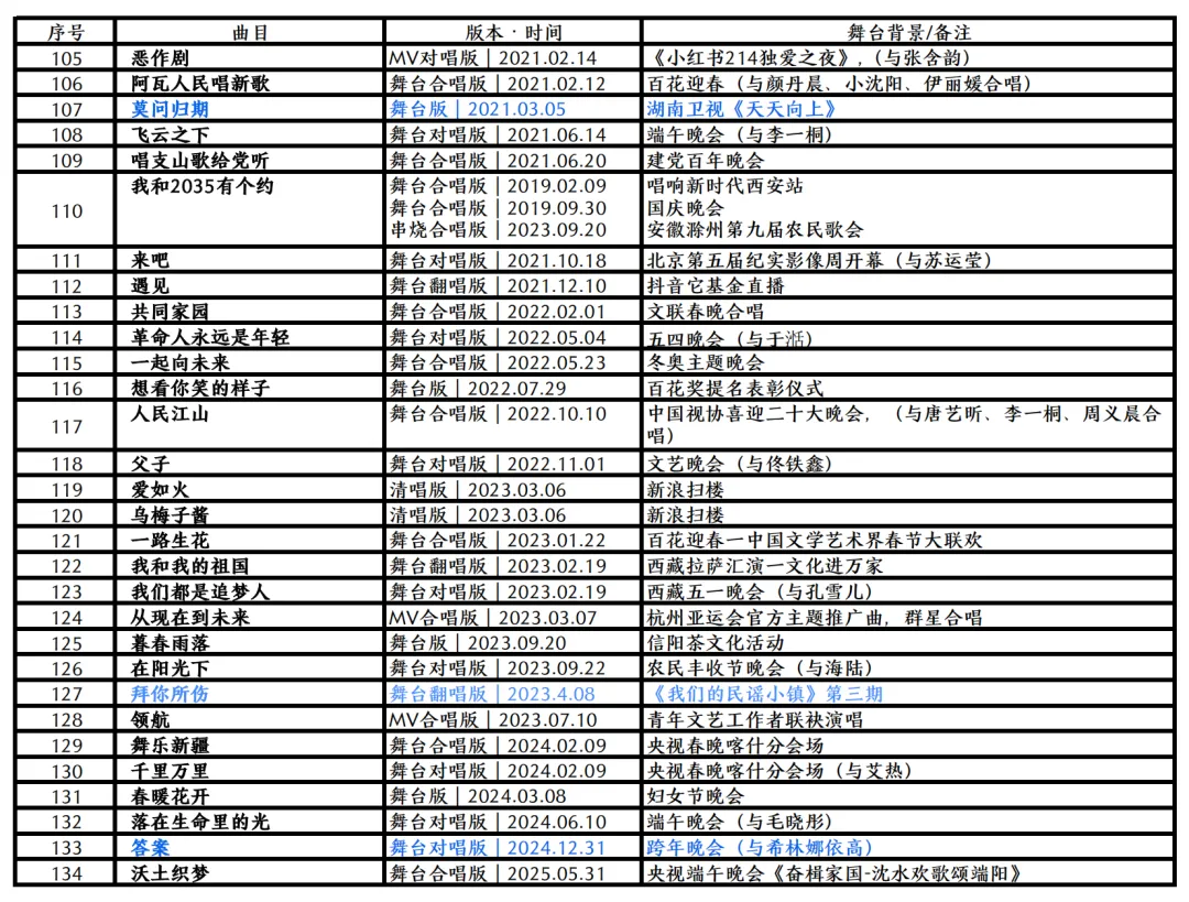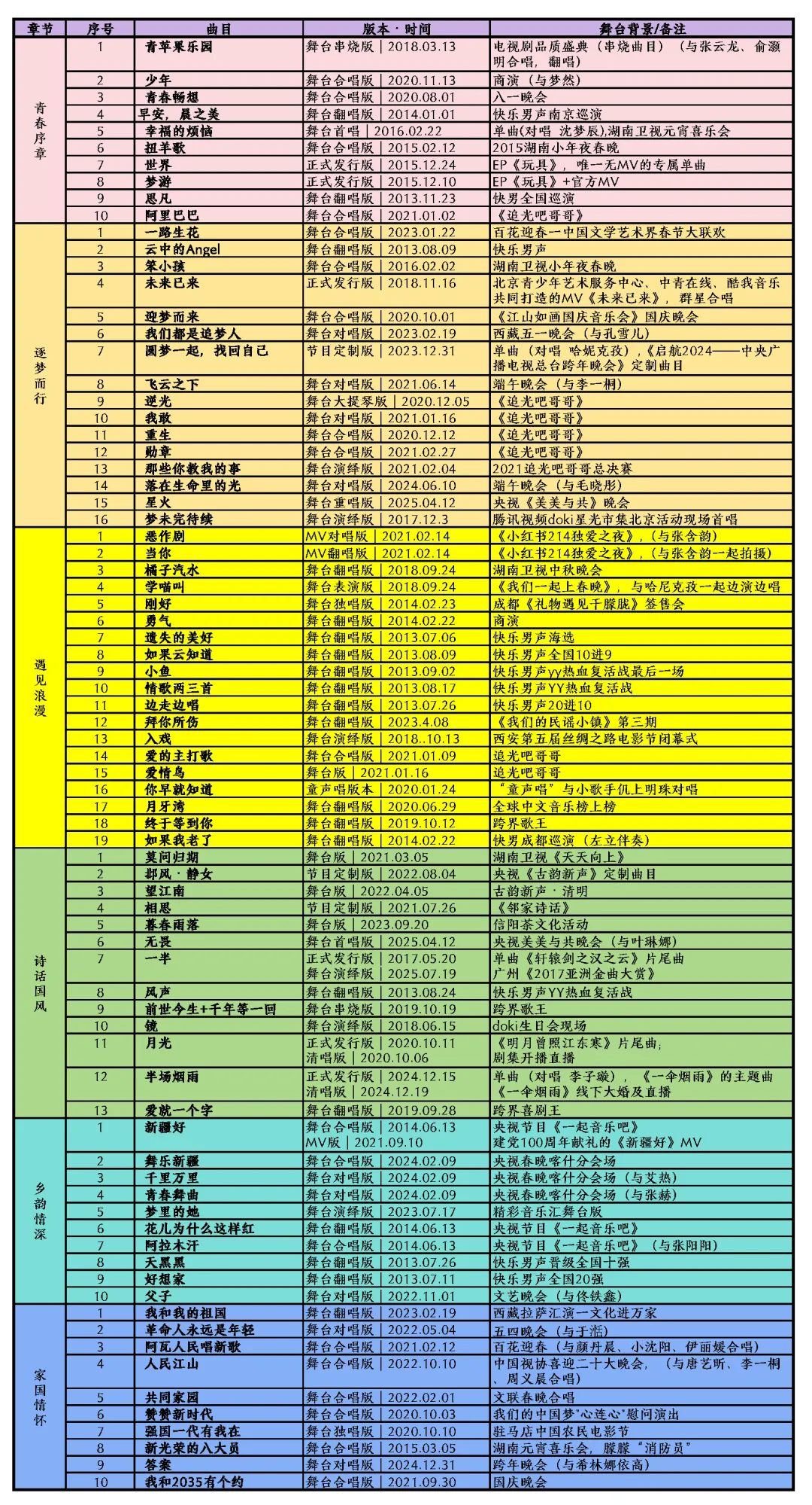 2013-2014年快乐男声的少年初声,青涩干净、满是赤诚,那是我们初识他的模样;2015-2021年的破茧成光阶段,以《追光吧哥哥》系列为分界点,共42首曲目,数量颇丰且每一首都彰显突破,让我们看到了他温柔外表下的坚持与勇气;2022-2025年央视、卫视各大晚会的风华亮相(贯穿其舞台生涯),从春晚喀什分会场到五四、国庆晚会,从端午古韵到跨年盛典,每一次登台都端庄得体、温柔如初。