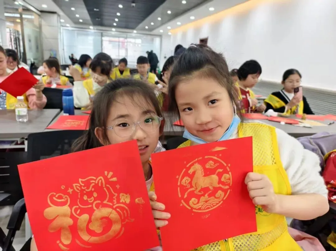 在“拓印迎春”活动中,同学们以金色墨汁精心拓印洒金福字,一笔一画都承载着对新春的美好祝愿。大家在浓郁墨香与喜庆红纸间,近距离感受传统印刷技艺的独特魅力,也在亲手创作中许下对新年的美好期盼与长远愿景。