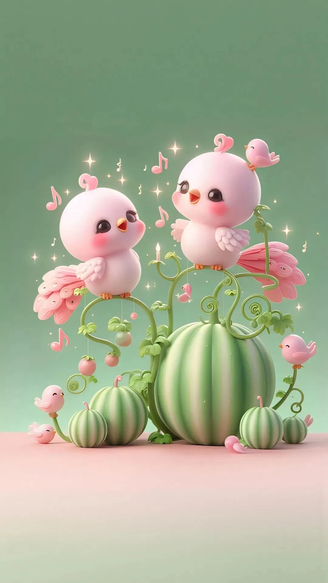 粉萌小鸟唱着歌,西瓜藤上撒糖撒爱心~
