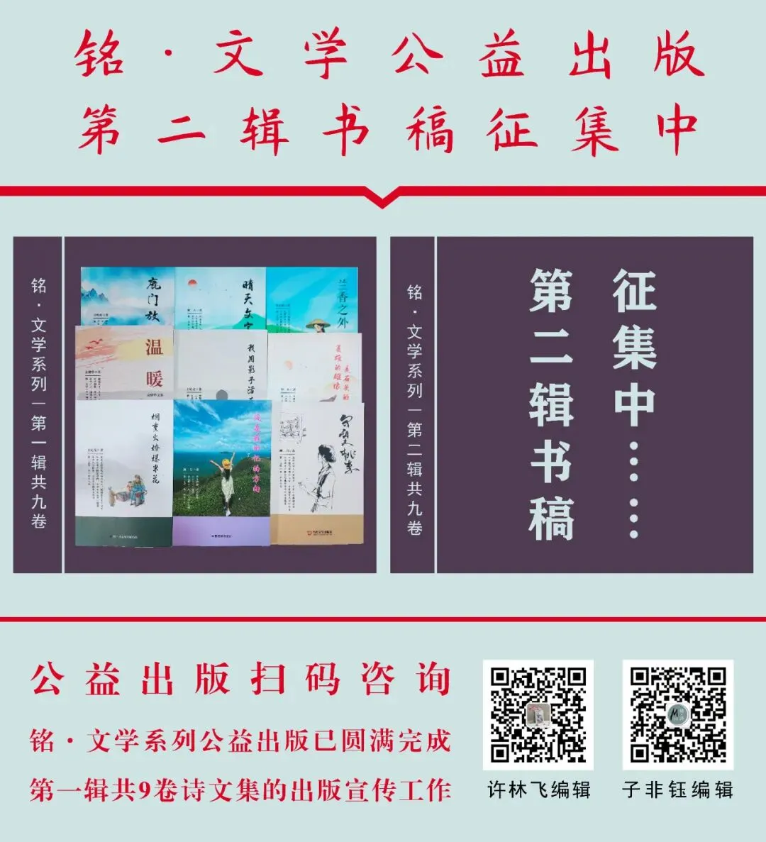 自2020年5月【铭·诗】文化传媒推出“铭·诗集”“铭·文学”系列公益出版项目以来,受到广大作家、诗人好评,并助力诗人、作家顺利出版诗文集,至今已圆满完成“铭·诗集”系列第一至十辑共90卷诗文集的出版发行等工作。秉着公益出版的初心,我们将继续以“铭·文学”系列为作家、诗人、协会等团体组织提供公益出版服务,本系列拟出版十辑,现已完成“铭·文学”系列第一辑共9卷诗文集的出版宣传等工作,“铭·文学”系列第二辑书稿征集中,拟公益出版九卷(可出版诗歌、散文、小说、随笔、评论等文学作品集)。详情如下: