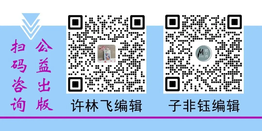 除公益出版外,【铭·诗】文化传媒还可为作者提供自费出版,包括国际书号、国内书号、设计排版、印刷发行等出版服务,详情加微信咨询。