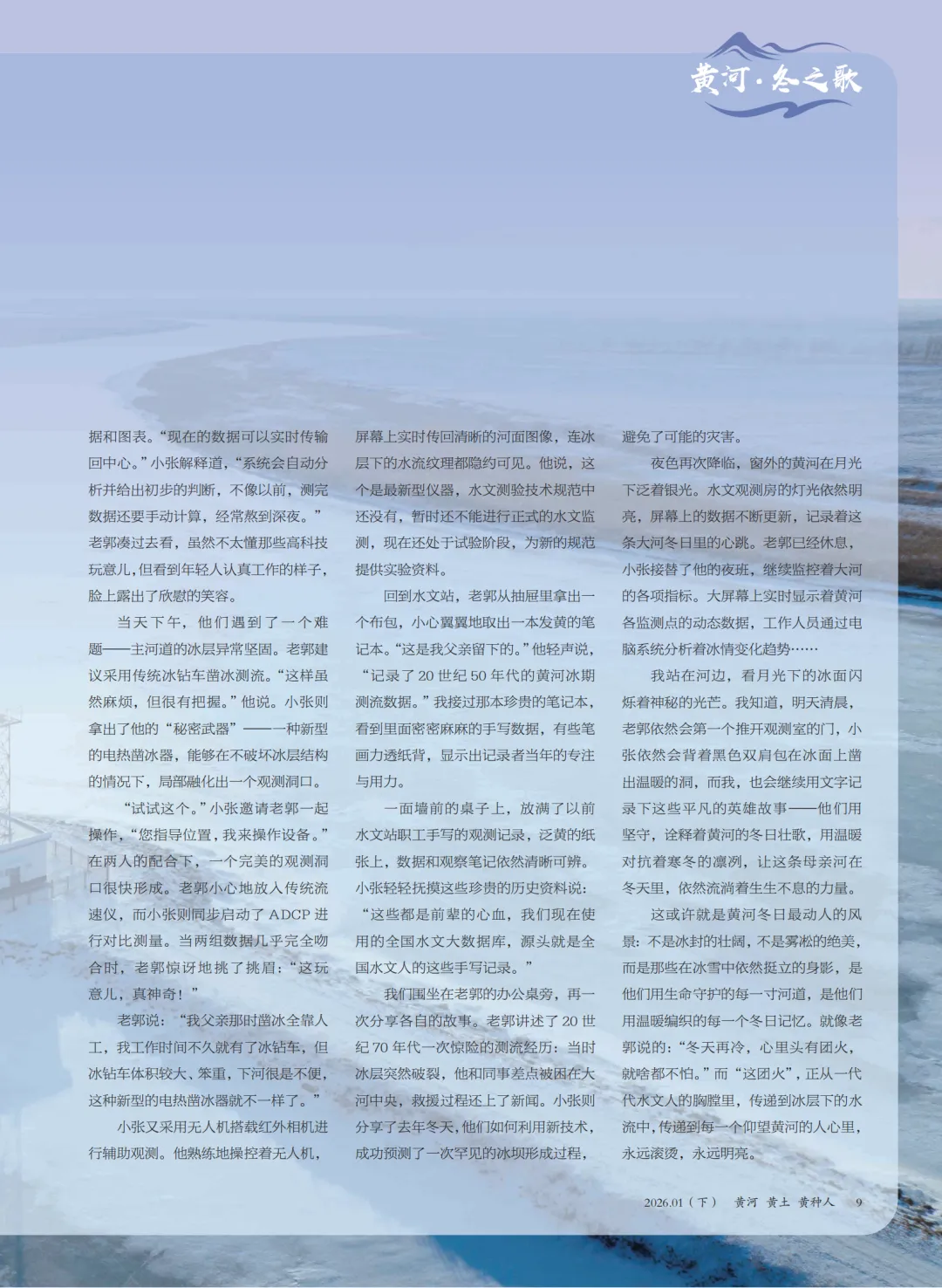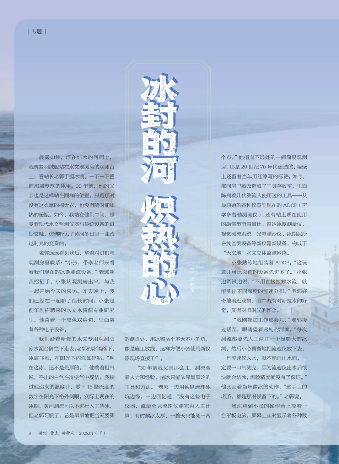 这或许就是黄河冬日最动人的风景:不是冰封的壮阔,不是雾凇的绝美,而是那些在冰雪中依然挺立的身影,是他们用生命守护的每一寸河道,是他们用温暖编织的每一个冬日记忆。就像老郭说的:“冬天再冷,心里头有团火,就啥都不怕。”而“这团火”,正从一代代水文人的胸膛里,传递到冰层下的水流中,传递到每一个仰望黄河的人心里,永远滚烫,永远明亮。
