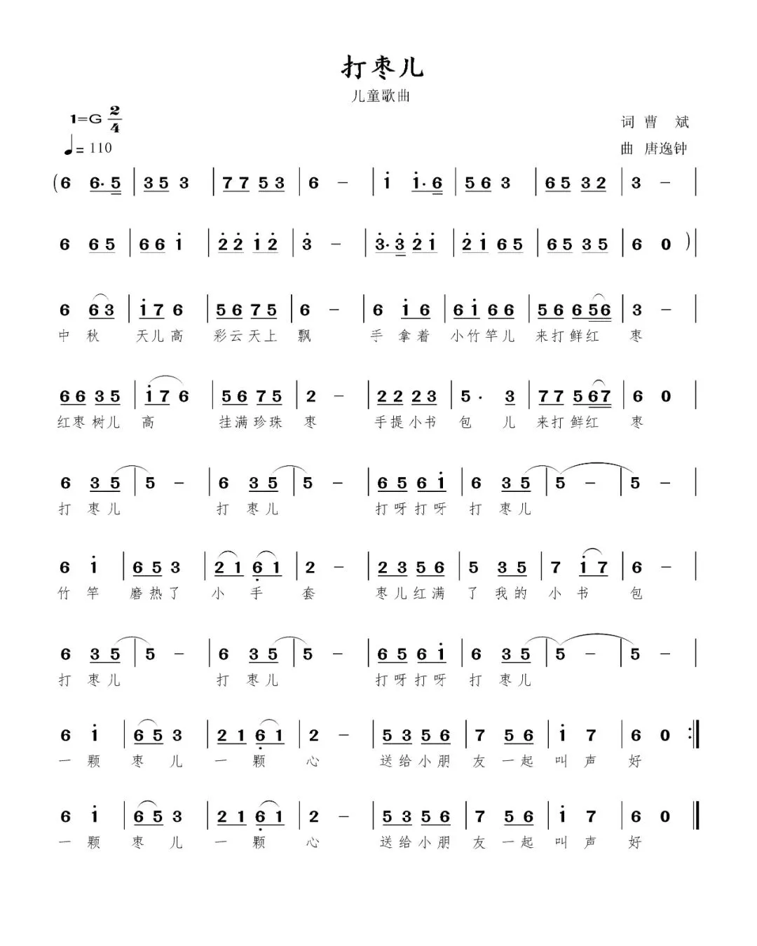 歌曲以中秋时节为时间背景,用 “天儿高”“彩云飘” 勾勒出清朗开阔的秋日画卷,歌词简洁明快,“手拿小竹竿儿”“手提小书包儿” 等生活化的细节,生动还原了小朋友们参与打枣的场景。“珍珠枣” 的比喻既点出临泽红枣的饱满圆润,又透着孩童眼中的天真趣味,而 “竹竿磨热小手套”“枣儿红满小书包” 的描写,更是将劳动的投入与收获的雀跃刻画得淋漓尽致。