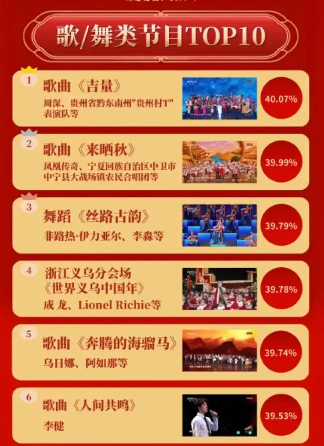 除此之外,这次的选歌也引起了争议,这首原曲评论不过百的小众作品,被认为缺乏全民共鸣,与春晚阖家团圆的氛围格格不入,相关收视数据也未能进入歌舞类节目前五。