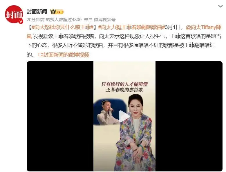 3月1日,向太陈岚在社交平台发布视频,怒怼恶意吐槽王菲春晚表演的网友,一句“你凭什么喷王菲”,让这场持续多日的王菲春晚争议,再度被推上舆论风口浪尖。
