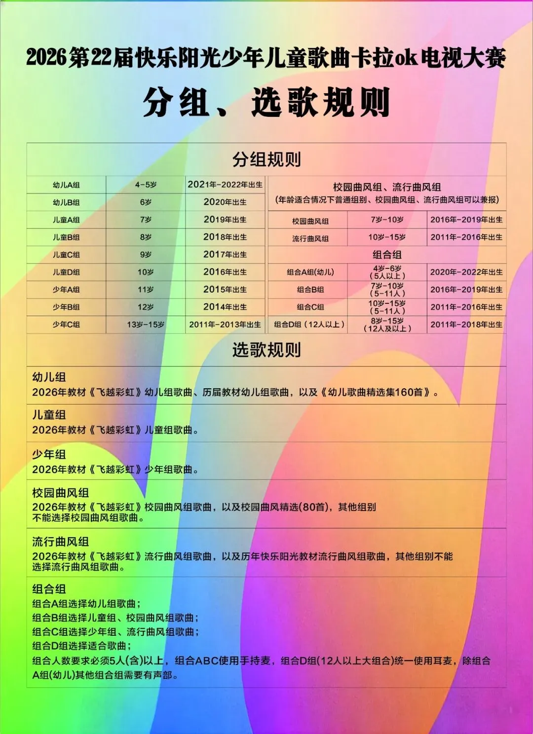 1、本届大赛规定,每位参赛选手,必须演唱组委会推荐的按组别选自“快乐阳光”《飞越彩虹》第22届中国少年儿童歌曲电视大赛歌曲208首少儿歌曲精选。