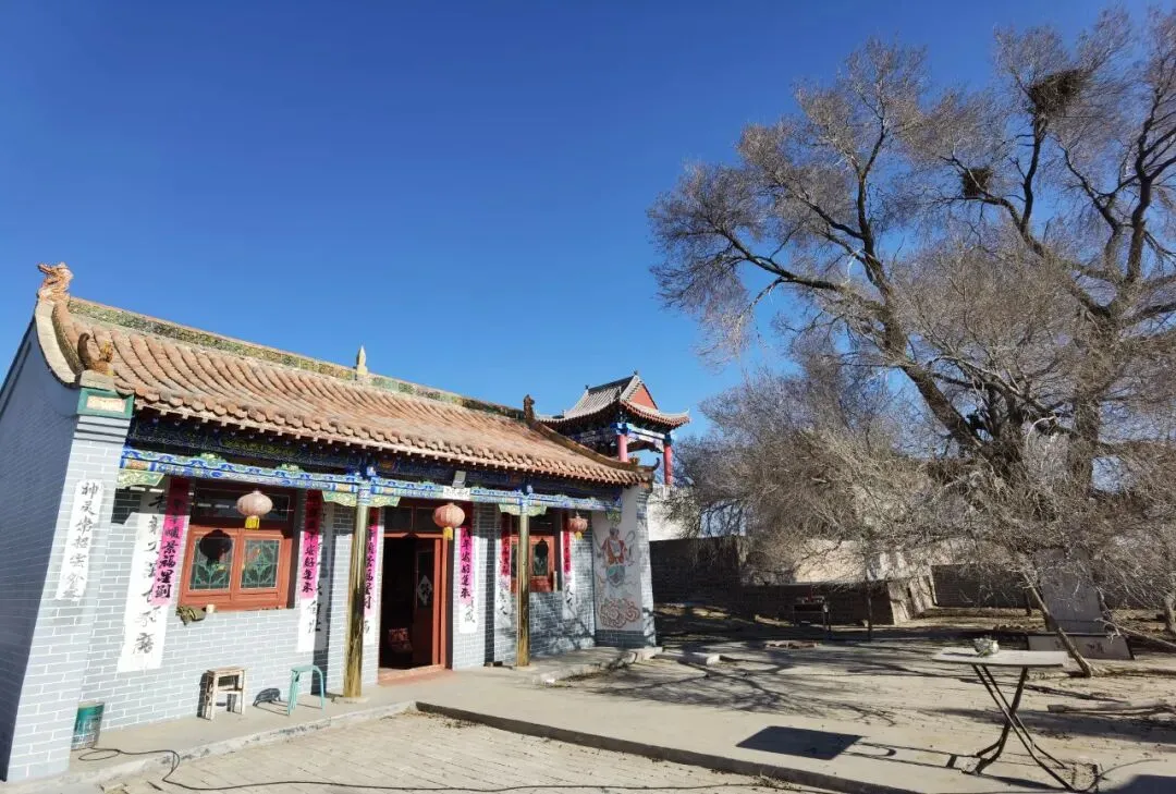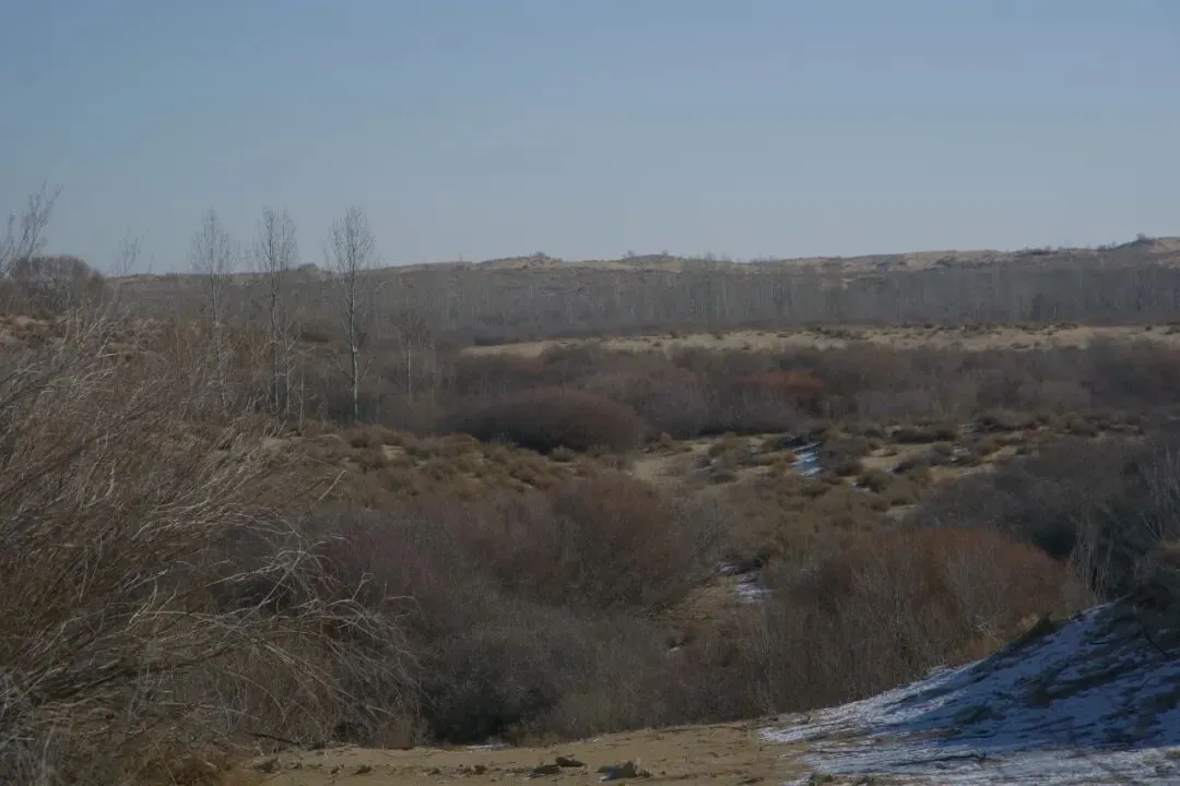 从展馆出来,我们去看了在一座关帝庙里的“八路军骑兵团遗址”。这里不仅驻扎过骑兵团,还曾经是地下党员们借敬神之名,秘密开会的地方。从庙所在的山头,能看到一片海子,原来这就是“木凯淖尔”,是这个村庄名字的由来。绕过淖尔,我们驱车去看红柳林,故事里曾经藏过红军的地方。红柳喜水,长在沙梁下的沟沟里,虽然冬天没有叶子,也能看出一簇一簇,非常茂盛,的确是藏身的好地方。