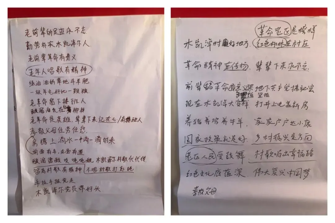 工作坊进行到第二天下午,终于开始正式写歌词了。我和孙恒根据前两天的走访,“我与村庄的故事”,以及“村庄大事记”等环节,梳理出整整一页大白纸的关键词,再加上老村长和其他几位村名贡献的歌词句子,成为歌词创作的基本材料。
