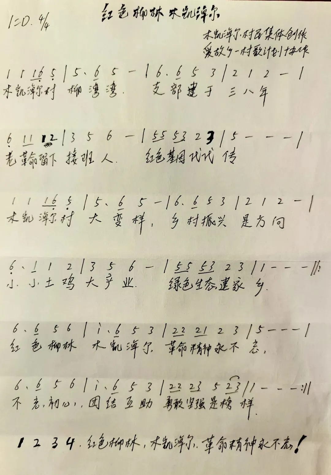 《红色柳林木凯淖尔》词曲初稿