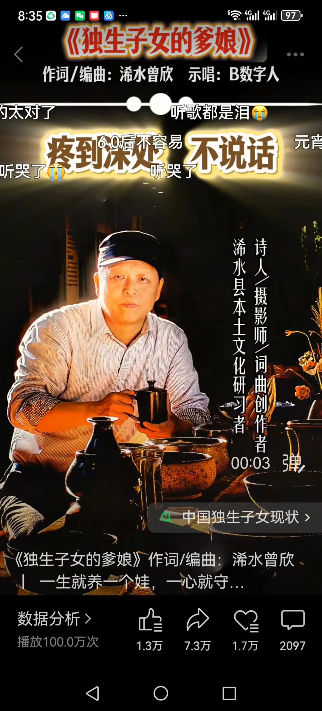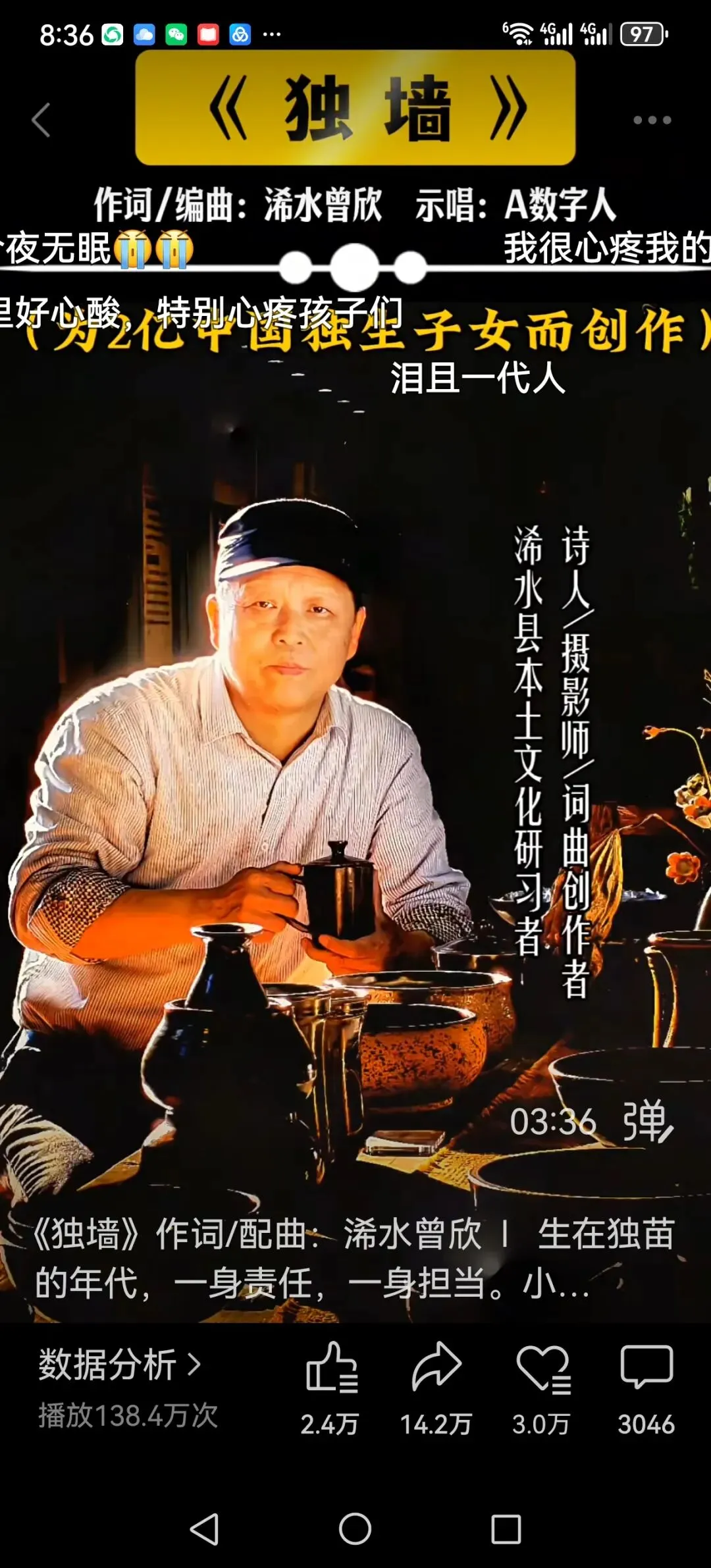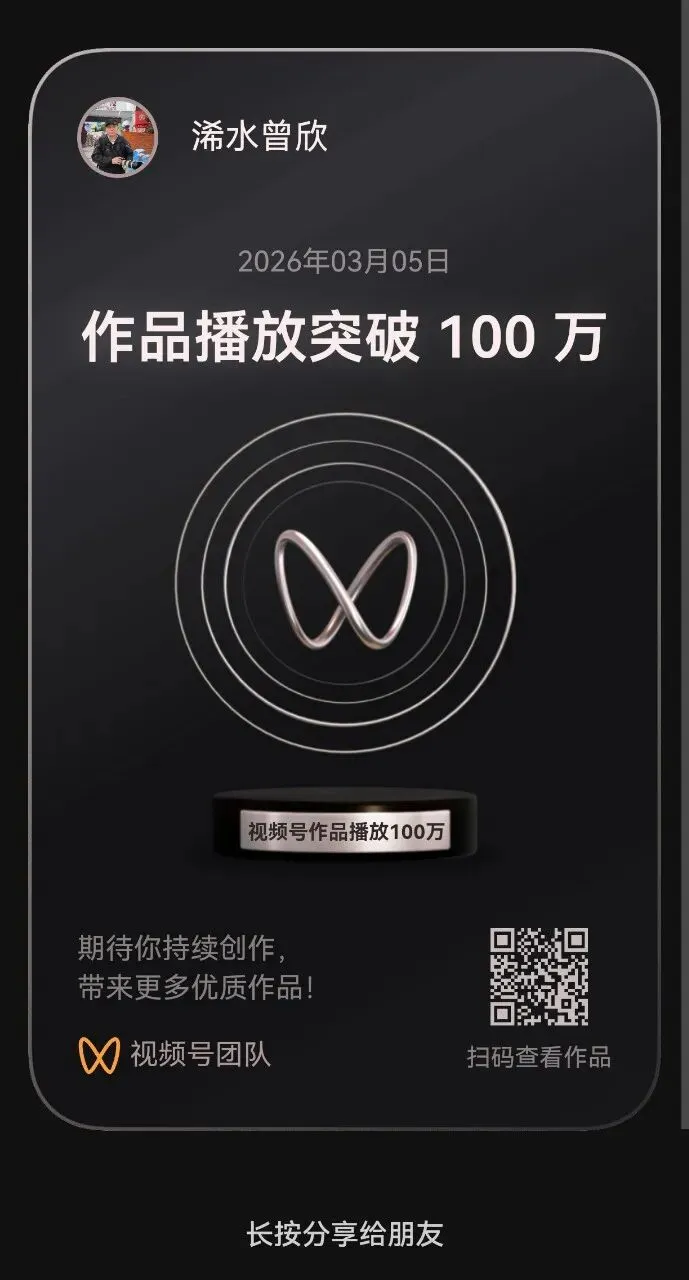 做一个记号。由我个人作词配曲的两首原创歌曲《独生子女的爹娘》《独墙》仅在视频号平台上发布20天的浏览量都已超过100万人次,其中《独墙》138.4万。