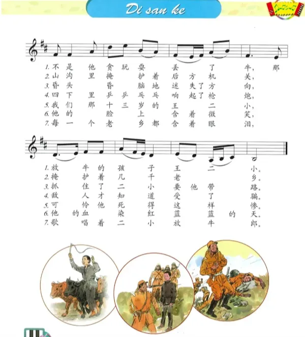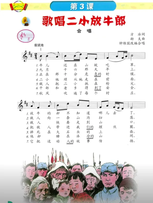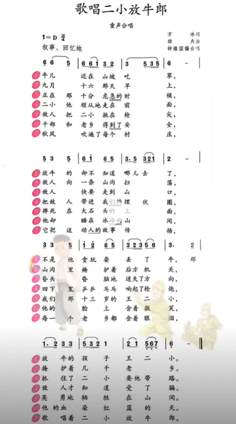 为了便于下面的分析,我们这里基于人民音乐出版社五年级课本《歌唱二小放牛郎》的五线谱例(合唱形式,独唱与合唱音乐结构一致)进行分析: