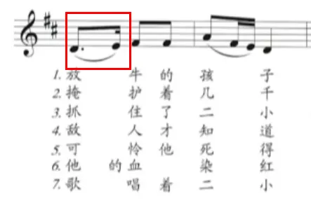以八分音符、四分音符为主,间有附点节奏,如 “放牛的孩子王二小”,规整中带变化,贴合叙事语气,传递悲壮感。