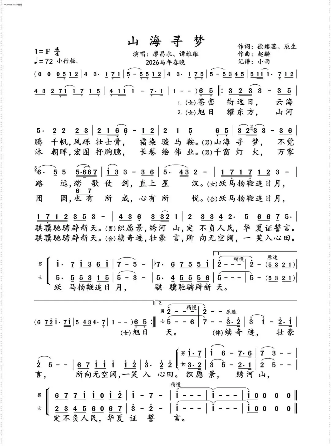 《山海寻梦》由廖昌永、谭维维演唱,于2026年2月16日首播。该歌曲致敬所有拼搏进取、耕耘奉献的中华儿女,共迎心有所悦、业有所成的崭新春天。在央视2026年春节联欢晚会的零点钟声响起时演唱。