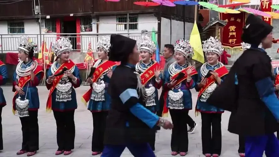 上午十一时,各支队伍陆续抵达村口。主家唱起悠扬的迎宾侗歌,用牛角杯给远道而来的客人敬酒,满是热情与诚意;宾客们也与主家对歌,祝愿活动顺利进行。锣鼓声声、侗歌阵阵、酒香四溢,隆重的侗族民俗活动就此拉开序幕。待所有队伍到齐,身着侗族盛装的人们扛起旗帜、敲锣打鼓、吹响号角,迈着整齐的步伐绕村子游行。独属于大山里的春天气息,瞬间在村寨的每一个角落弥漫开来。