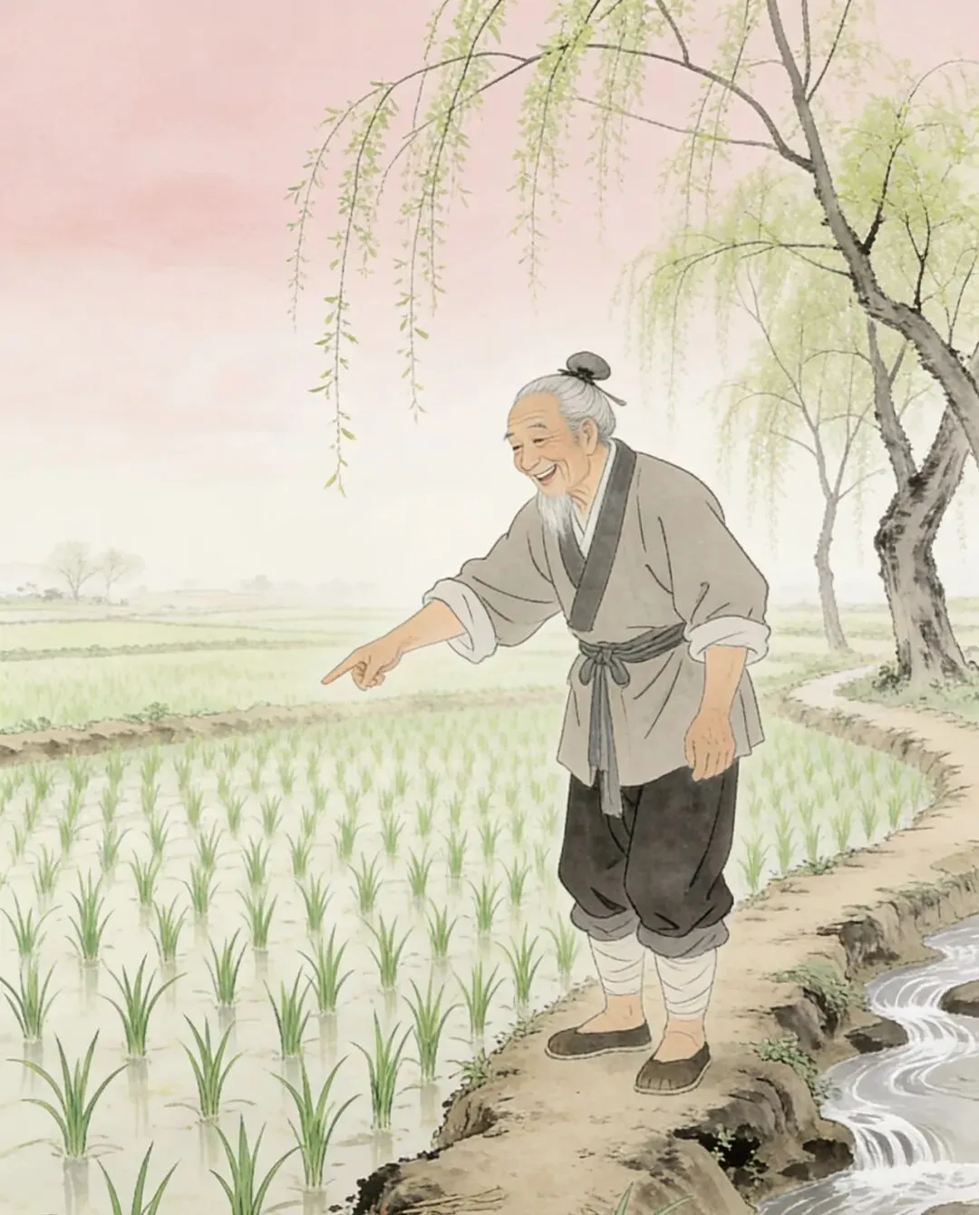 田翁笑指青苗短,溪女闲抛柳线长。