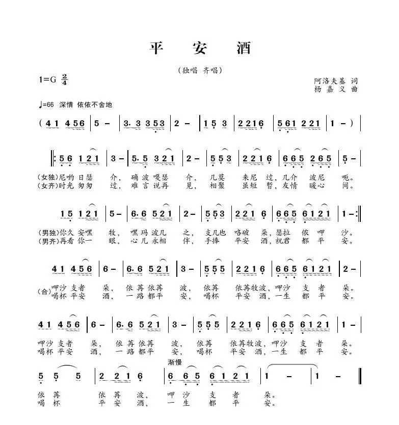《平安酒》根植于马边本土民族文化,是对彝族传统文化的深度挖掘与当代表达。彝语部分婉转悠扬,道出岁月流转中亲友间的牵挂与情谊;汉语部分真挚朴实,“手捧平安酒,祝君都平安”直抒对平安顺遂的真切期盼。作品既承袭彝族酒歌“以歌传情、以酒表意”的古老传统,又赋予其直抵人心的时代感染力,让乡土情怀与美好祝愿随歌声广为流传。