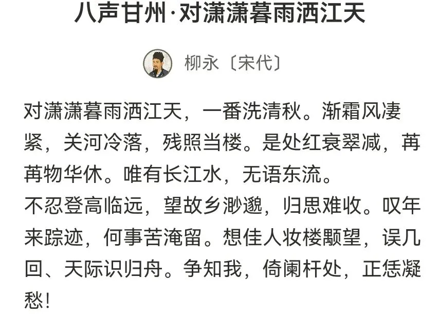 你不必懂诗词格律,不必懂柳永生平,甚至不必懂这首词在写什么。