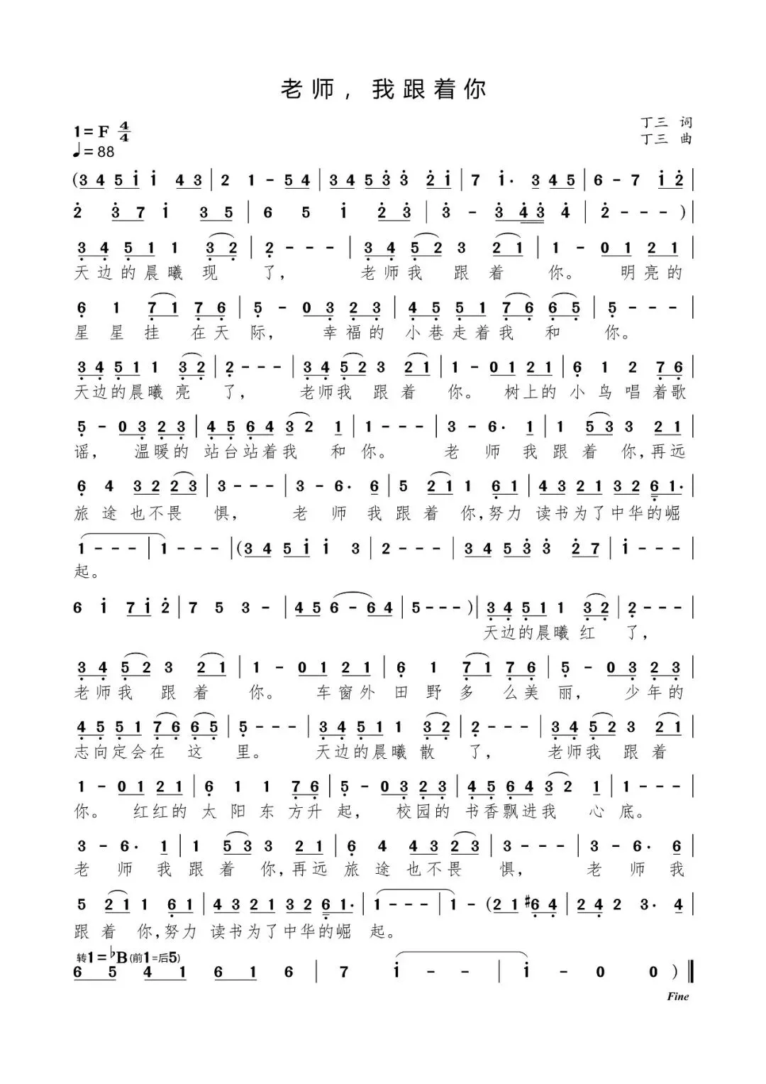 《老师,我跟着你》是丁三创作的一首情感真挚、意境清新的少儿歌曲。作品以晨曦的变化为线索,以师生相伴的日常为画面,将感恩、成长、理想与家国情怀融为一体,旋律温暖、语言朴实,既贴近少年儿童的生活,又具有深刻的教育意义,是一首充满力量与温度的校园音乐佳作。