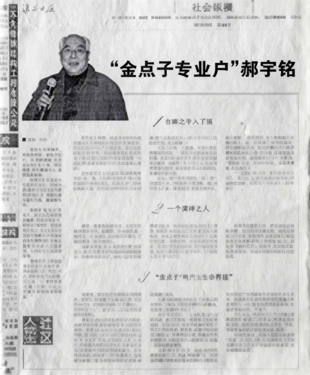 我退休后随儿子落户淮安市养老,爱好读报撰文,诸多建言献策、诗词、文章见诸报刊。《胜利欢腾记犹新》反映抗战胜利宝应城里热闹景象。依据1946年在南京的见闻,写下了《公审周佛海旁听记》与《抗战胜利展览会参观记》。此外,《苏中公学在金吾庄》《第一次见到新四军》等作品,记录了革命岁月中的点滴;而《丁芒与淮安的文化情结》《丁芒走向江苏的延安》等文章,则讲述了文化名人与淮安的深厚渊源。这些文章不仅发表于多家报刊,部分内容还被市、省电视台采用。我热心于城市文化建设,提出的建设“中国地理南北分界线标志园”、淮安区“古城墙遗址公园”等十余条建议,均获得时任市委书记丁解民的批示与采纳,并最终落地建成,成为淮安的城市名片。2011年,《淮安日报》曾刊发《“金点子专业户”郝宇铭》一文,对我进行专题报道。