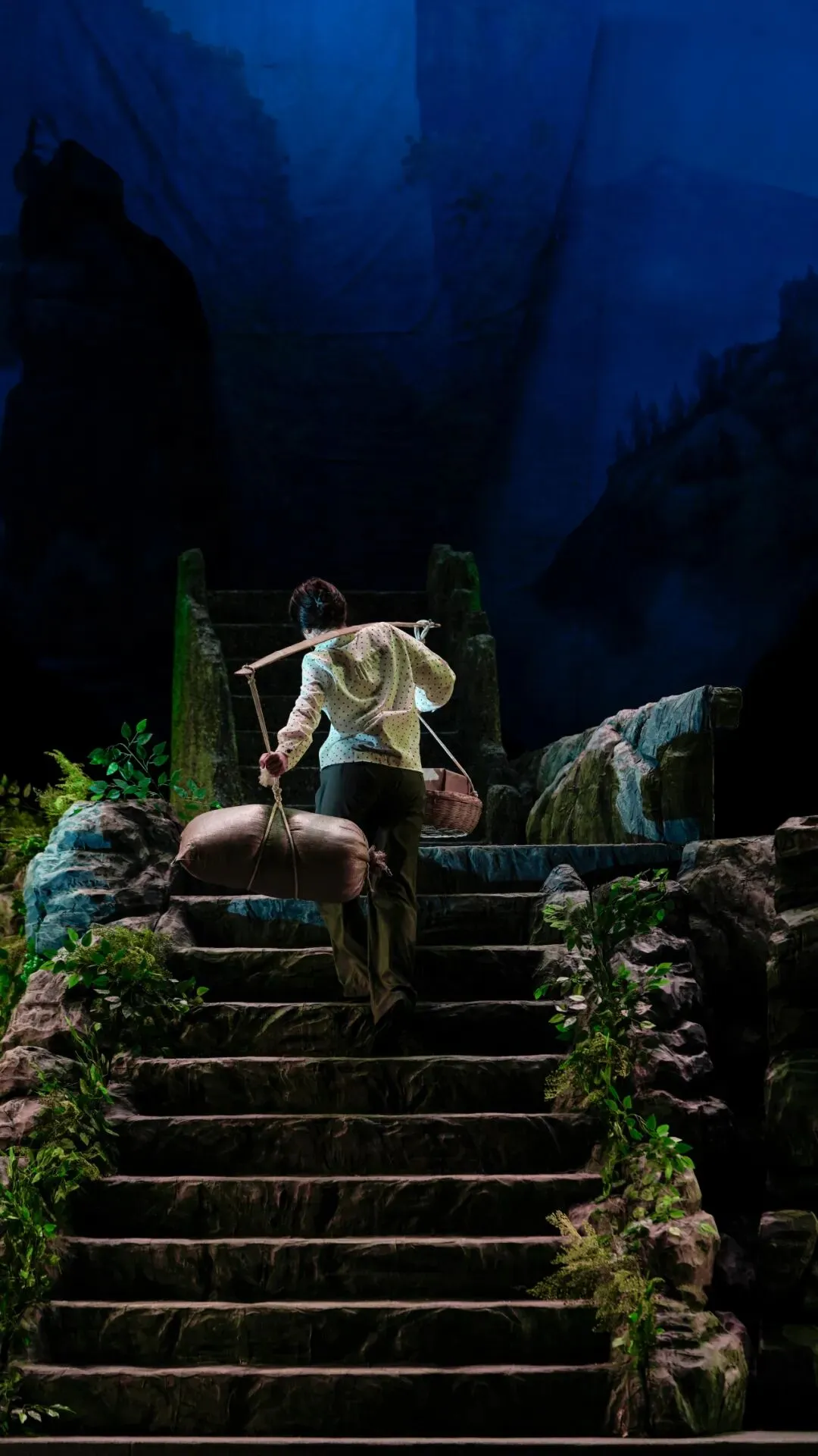 这部戏是由真实故事改编,著名沪剧表演艺术家华雯老师担当主演。这部剧的表演风格是注重写实性,整体注重人物的真实刻画,同时又吸取了部分戏曲的程式化运用,也比较适合眉户剧种真实、自然的现代戏表演风格。剧情讲述了女主人公王美英在丈夫意外身亡后,为抚养三个年幼的孩子(其中一个是双目失明的残疾儿),毅然选择了连男人都望而却步的谋生方式——挑山工。17年里,她在齐云山那3700级石阶上来来回回攀爬了20多万公里山路,磨坏了100多双解放鞋,挑断了70多条扁担,最终将一双儿女“挑”进了重点大学。当晚的观众很热情,每场结束都给演员献上热烈的掌声。当谢幕结束后观众蜂拥至台前不断叫好,那一刻的光彩是属于《挑山女人》剧组的全体演职人员,更是属于主演许丽君的。她对人物塑造执着刻苦的琢磨,对演出服装造型细节的精益求精才能使她塑造出这场演出中鲜活的王美英。