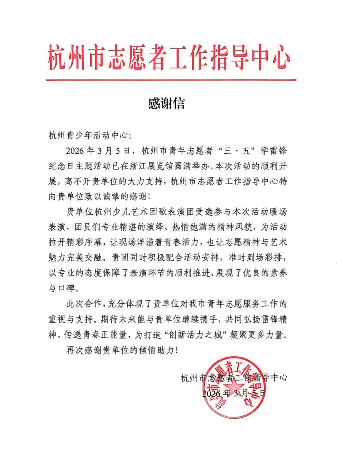 2026年3月5日,杭州少儿艺术团歌表演团受邀参演由共青团杭州市委、杭州市青年志愿者协会主办,杭州市志愿者工作指导中心、共青团拱墅区委承办的杭州市青年志愿者“三·五”学雷锋纪念日主题活动,用童声传递志愿温情。