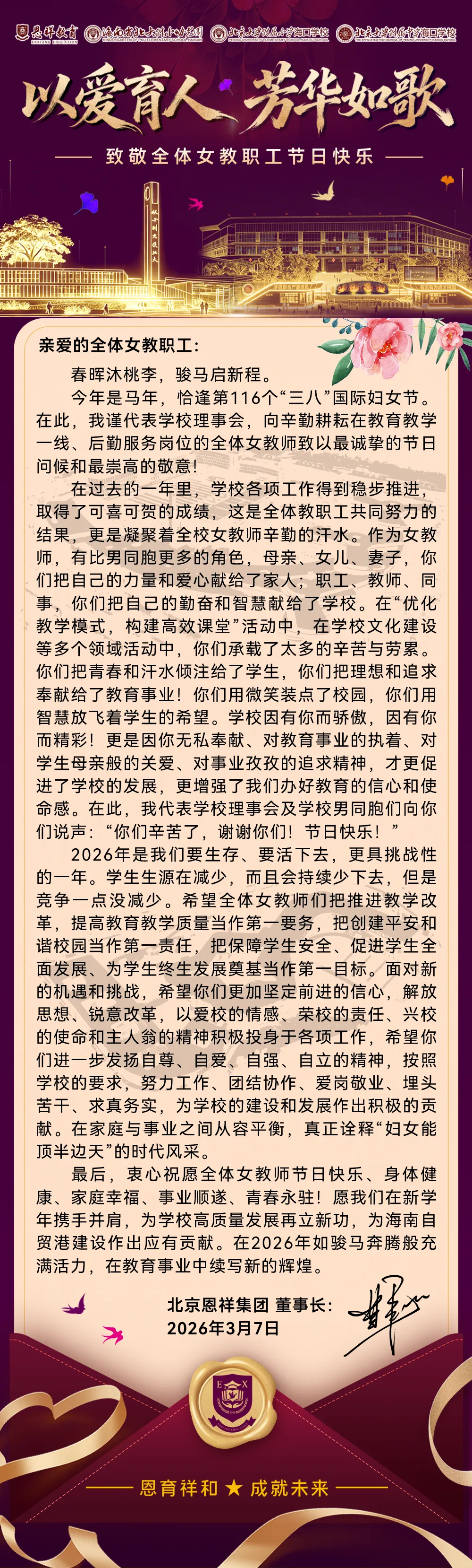 手捧礼盒的温馨时刻,喜悦在眉梢流淌,暖意在心头绽放。与此同时,北京恩祥集团董事长、北大附中附小海口学校及幼儿园理事楚军红女士也为全体女教职工送上了一封情真意切的慰问信,字里行间满载着节日的问候与崇高的敬意,传递着深深的感恩与殷切的期望。
