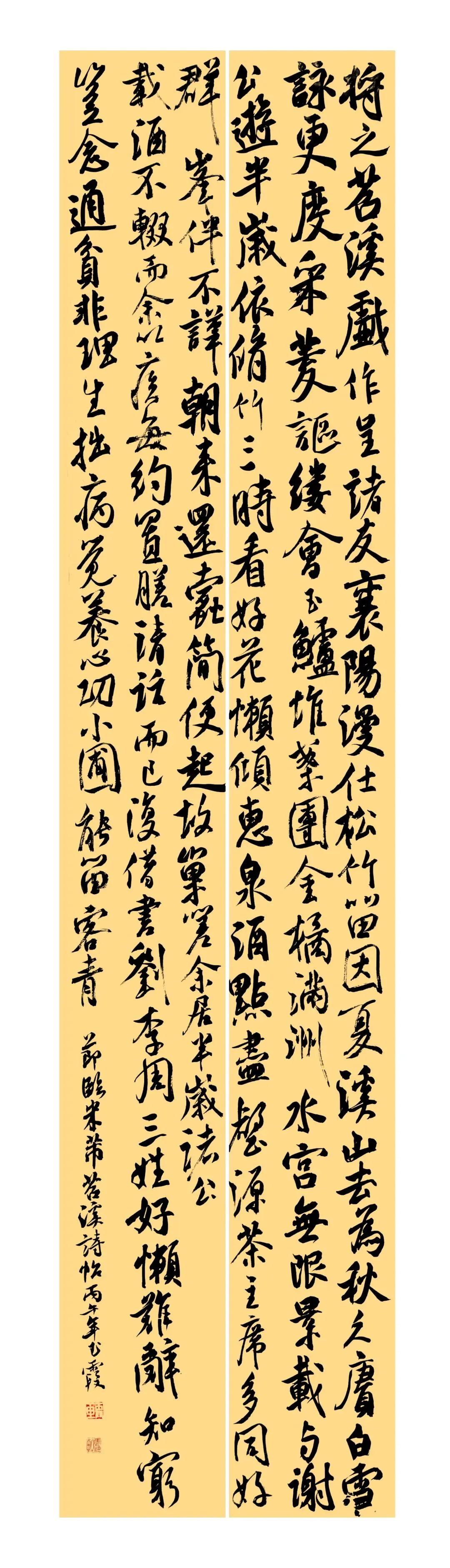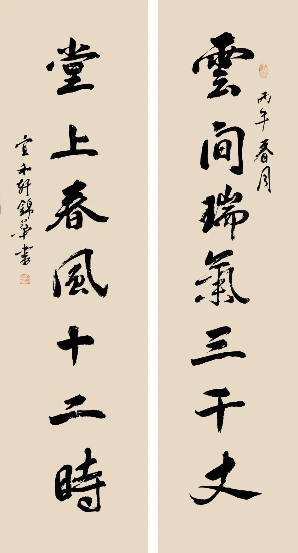 朱锦华《云间瑞气三千丈堂上春风十二时》138cm×34cm×2