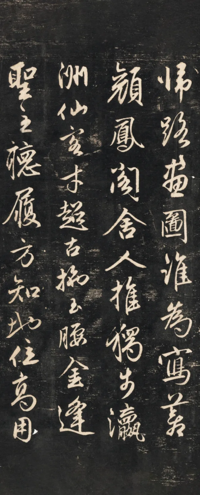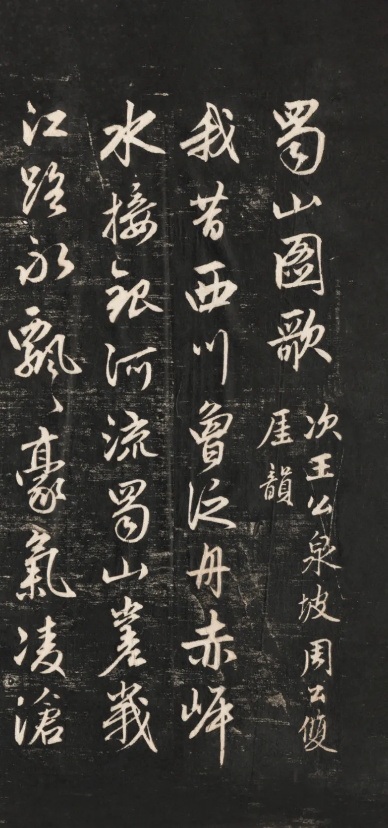 赵孟頫书《蜀山图歌》清末拓本,纸本,原藏于清代那彦成家,并被刻石于保定莲池书院墙壁,广传于世。《蜀山图歌》的内容是赵子昂在看到一件蜀山图之后的感喟,感叹于山河之壮丽与险峻,对于生发出来对于人生的感喟/kuì/。此卷后有明代陈继儒、李流芳等名家题跋。其书迹原件已轶,但就拓本全篇看,笔圆墨韵美,字里行间展露飒/sà/爽之风。
