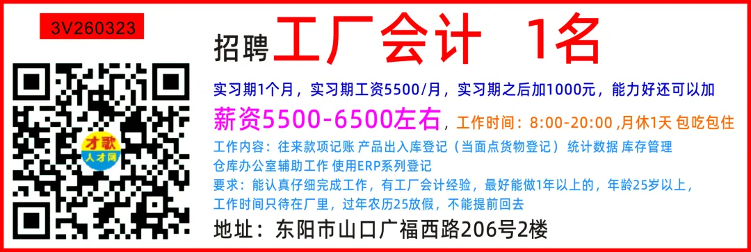 诚招配货打包员 3名底薪:4800-6000(月休1天)要求:要会看快递单子配货阿里巴巴运营助理 3名底薪:4000-5000(周末单休)要求:会上链接,懂平台规则只招有电商仓库经验的,长期长年工人上班时间:08:00-18:30,午休1小时餐补300元/月,做到年底有房补350元/月地址:东阳白云街道城南西路290号(东阳银泰城附近)