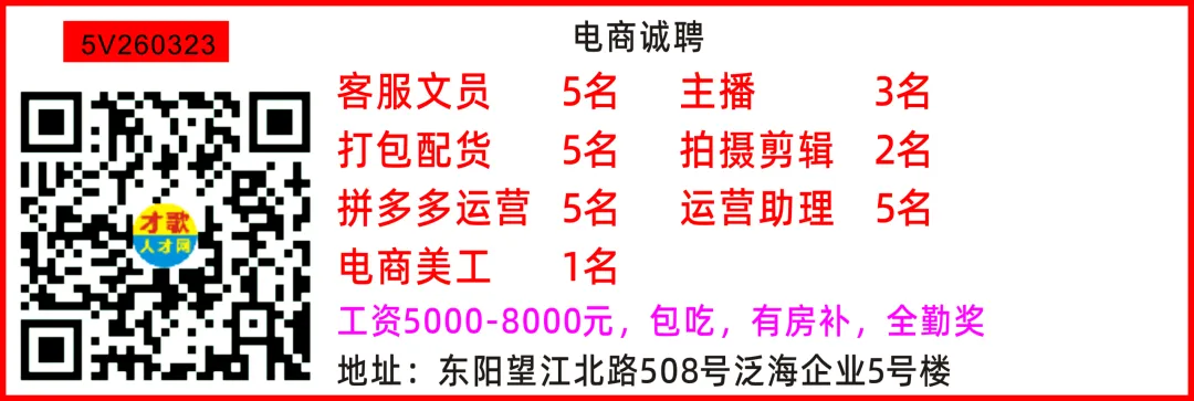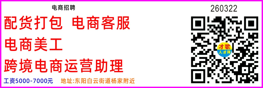 电商招聘跨境电商运营助理工资4000-15000元电商客服电商美工配货打包工资5000-7000元地址:东阳市白云街道杨家村附近