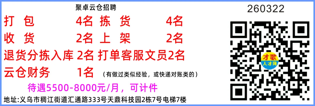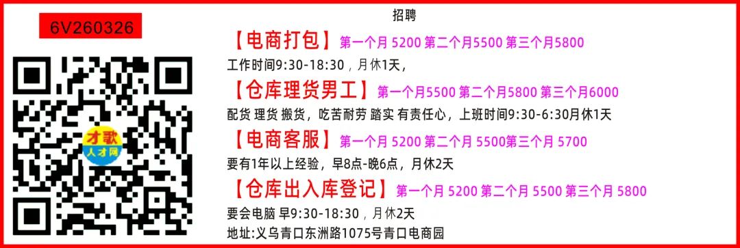 电商招聘配货员35岁以下,细心认真月休2天,工资保底6000+客 服拣 货工资计件绩效+提成,保底6000+地址:义乌江东东路1526号壹方大厦