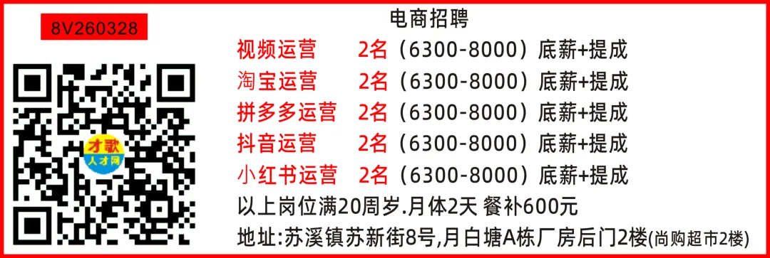 招 工电商主管 1名打包配货 2名淘宝客服 1名拼多多运营(学徒也可) 1名要求:女性能吃苦耐劳,做事灵活,认真负责(微信同号加微信咨询)地址:苏溪三小旁边
