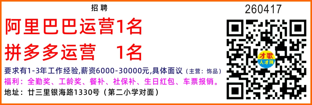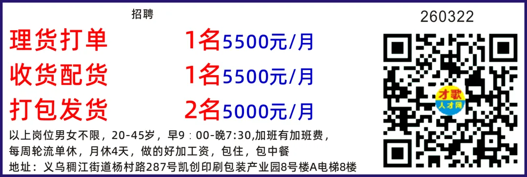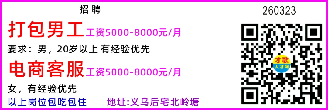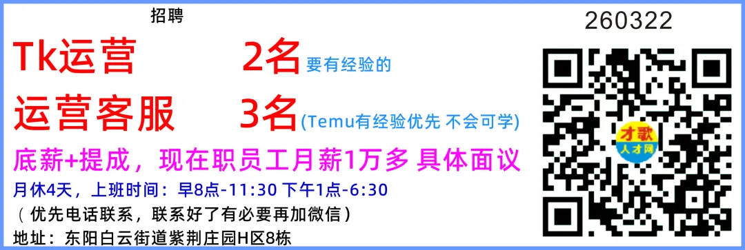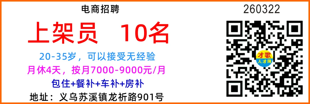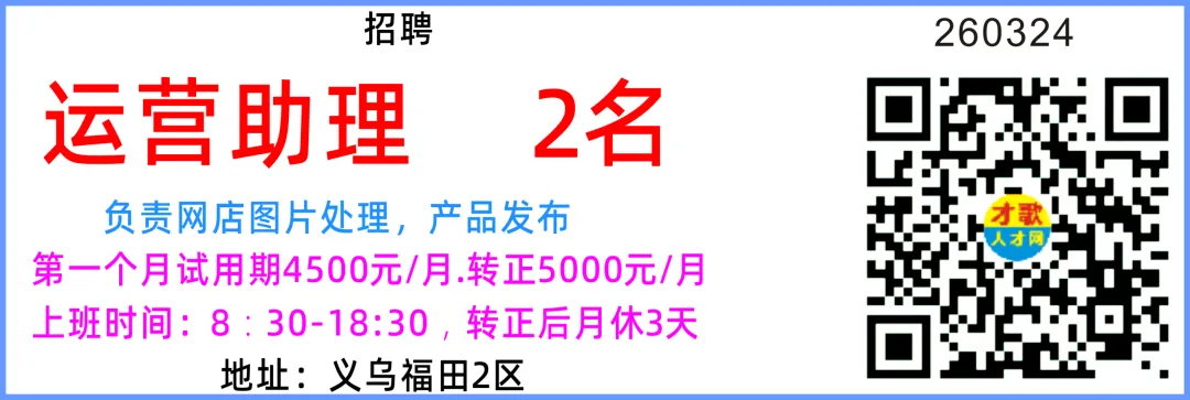 招聘电商运营(运营助理) 10名要求:国内平台和跨境平台运营岗位都招,小白可教,脑子要灵活,笨笨的不要,有老手一对一指导美工 5名薪资面议要求:1、精通Photoshop、AI等图文设计软件使用;2、按要求在规定的时间内完成广告制作图的设计和制作。女文员 10名薪资面议、月休3天、不会可学要求:1.年龄 25 岁以下、应届毕业生也可,大专学历优先 2.会一点 PS 技术、不会可教3.头脑灵活,品行端正,有责任心。工作内容:运营店铺数据、打单、发货打包发货 10名薪资面议、月休2天要求:品行端正,有责任心,能吃苦耐劳。工作内容:贴标打包发货过年不打烊,工资翻倍+奖金地址:义乌市福田街道荷叶塘区物华路68号3号楼D电梯口3楼399