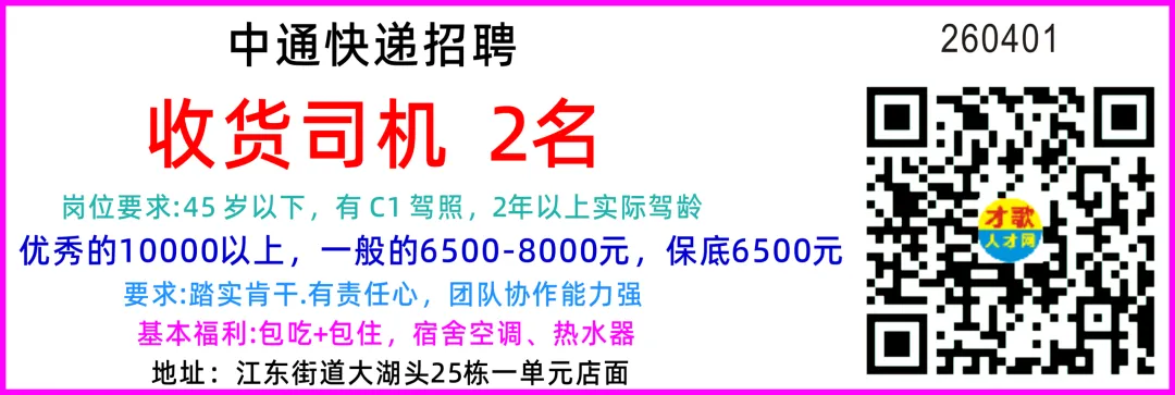 中通快递招聘派件员工资10000+开4米2车,要求做过的,能吃苦耐劳收货司机开4米2车,工资面议电话(微信同号)地址:北苑街道西站大道万村七区六栋