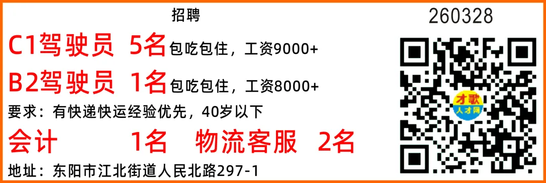 招聘司机 2名工资7000-8000跟车 2名工资6000-7000主要工作: 负责送货到外贸仓库,两个人一台车,要装卸货,能吃苦耐劳,对工作负责,有工作经验者优先具体面谈(年龄25-50岁)地点:东阳市北鹿西街699号