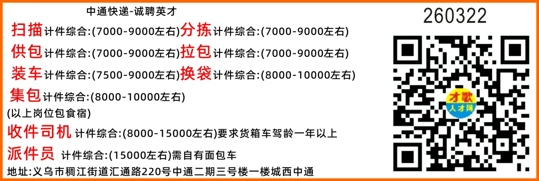 义乌江南中通招聘装 车 2名手工线集包 5名自动线换袋 5名巡 检 2名退 件 2名以上综合工资6000-10000元司 机 数名[薪资]:综合工资 6000-15000元 能吃苦耐劳、服从管理没有不良啫好[要求】:男、1 年以上驾驶 4.2米厢货车经验 [时间】:早上 10:00 取件结束长期兼职小时工 数名薪资18元/时 上班时间18:00-24:00客服 2名4800-8000左右上不封顶 8:30-18:00[福利靓点]:包吃包住、全勤奖、年终奖、工龄奖以及节假日发放礼品等福利[要求]:男女不限、吃苦耐劳、没有不良嗜好、要有团队精神[上班时间]:下午14:00-操作场地结束以上岗位联系:第一位159和第二位158电话文 员 1名薪资待遇面谈(工作主要内容:统计数据,熟练excel)文员联系:第三位137电话地址:义亭姑塘工业区华统集团二栋1号电梯6楼综合部办公室