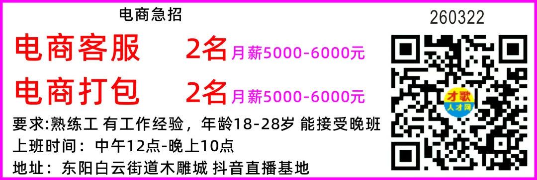 电商诚聘带货主播 2名工资5500-8000元,一天2场 一场4小时客服 1名做过拼多多 抖音 淘宝的优先,工资5000-6500元工作时间早班8.00到6.00 晚班1点到11点 倒班制打包配货 数名工资5500-7000元,早上9点上班-晚上7.30、加班有加班工资理货 1名早上9点上班-晚上7.30,工资6000-8000元仓管 1名工资6000-8000元早上9点上班-晚上7.30,有做过电商仓库管理经验的以上岗位不包吃不包住地址:东阳市江北街道西凤路8号