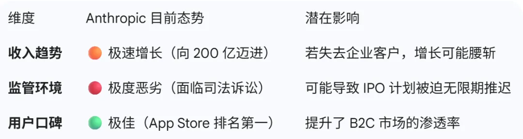 就在商业飙涨之际,公司却陷入与美国政府的重大冲突。美国国防部近期将 Anthropic 标记为 “供应链风险(supply-chain risk)”,并要求在国防相关合同中停止使用其 AI 技术。
