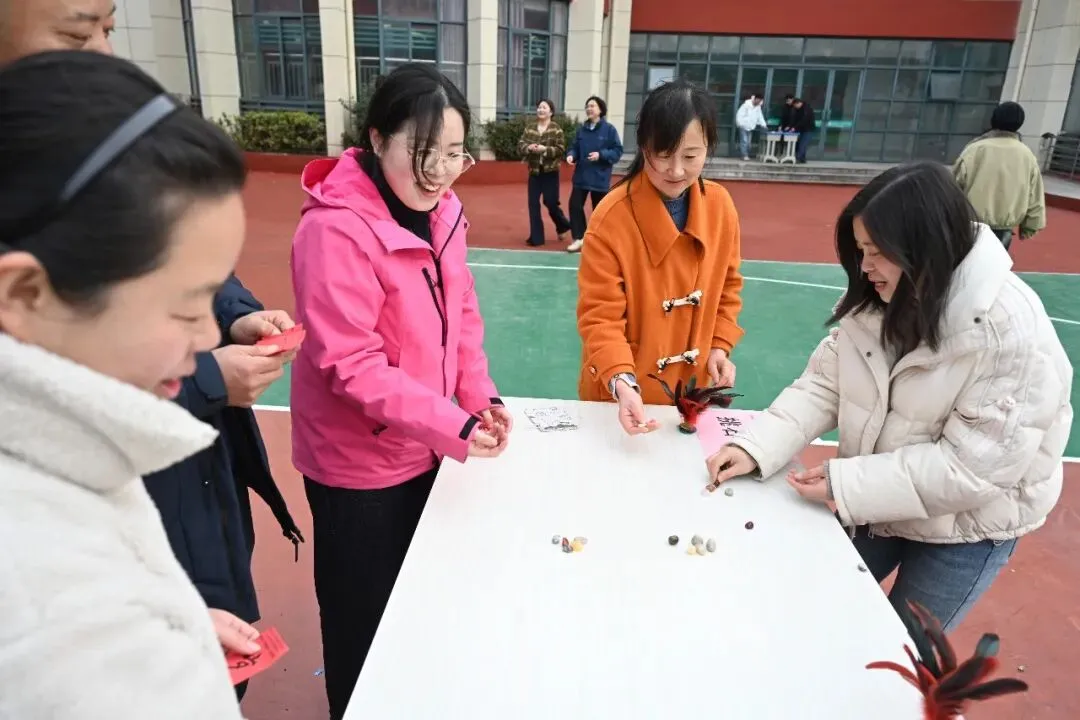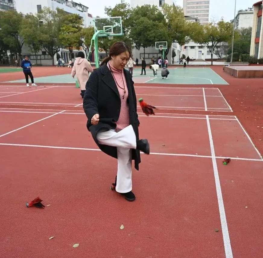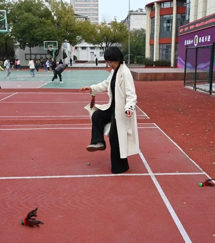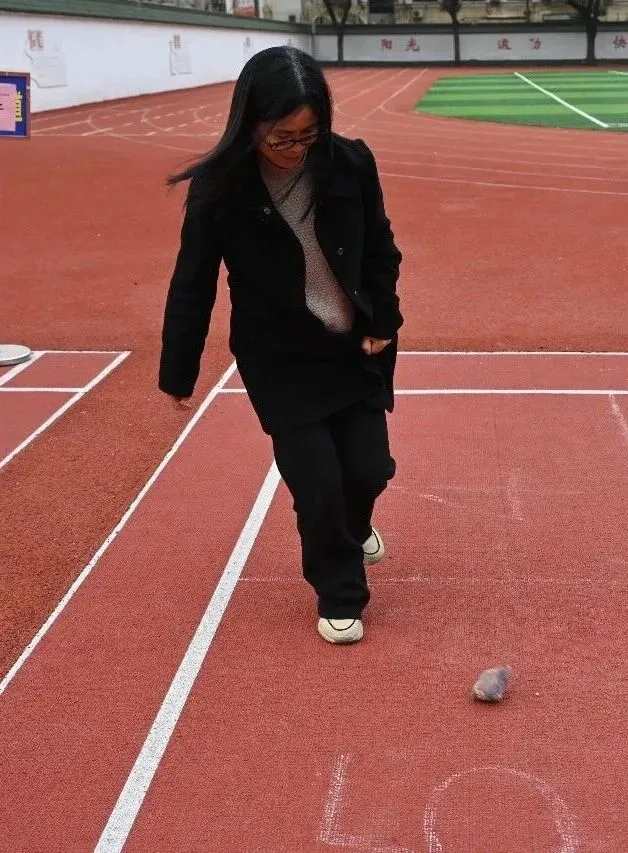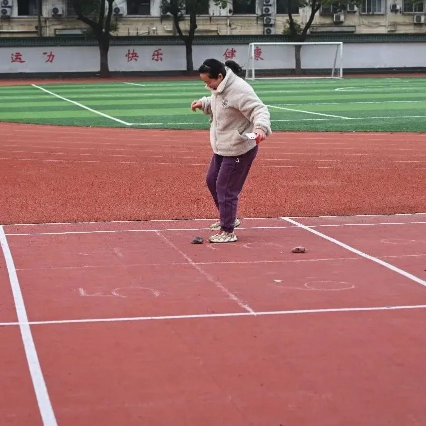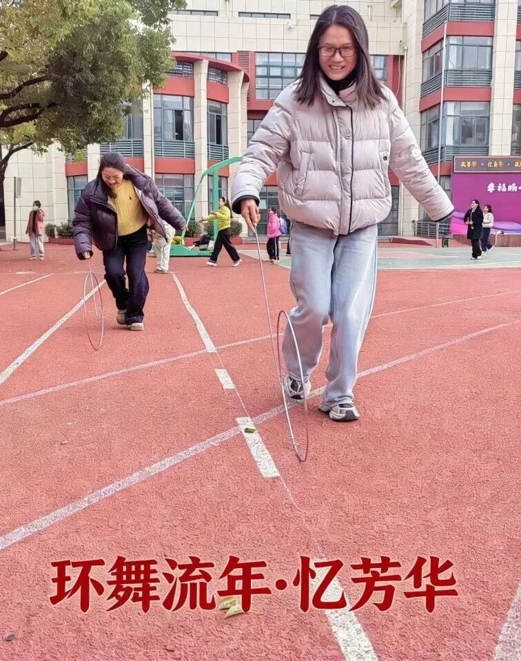 随着旋律响起,女教师们迫不及待地奔向各个游戏区域。滚铁环区,铁环在手中滚动,仿佛回到放学后的小巷;抽陀螺区,鞭子一抽,陀螺飞旋,笑声不断;跳房子区,单脚跳跃,格子间拾起儿时的快乐……每个游戏项目都由帅气的男教师志愿者守护,确保安全又贴心。