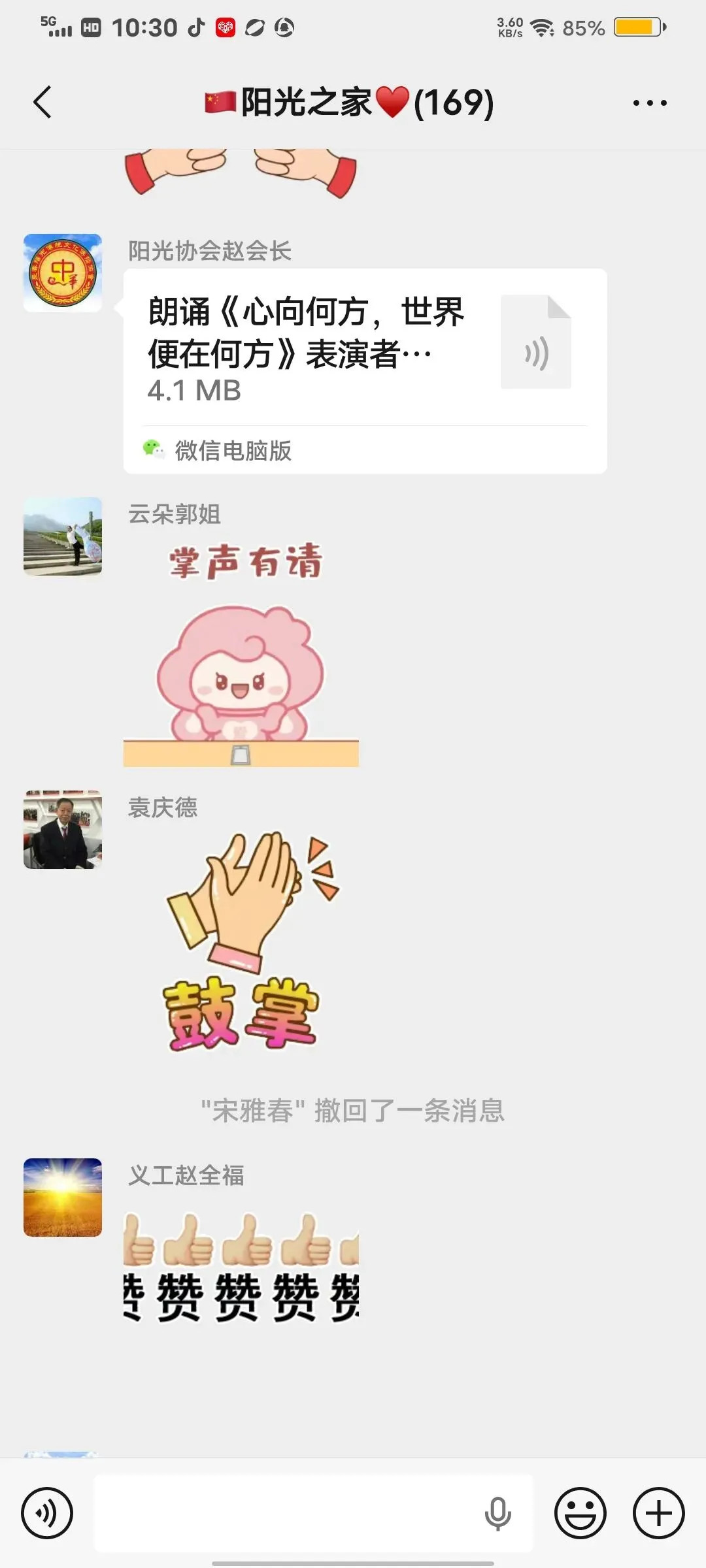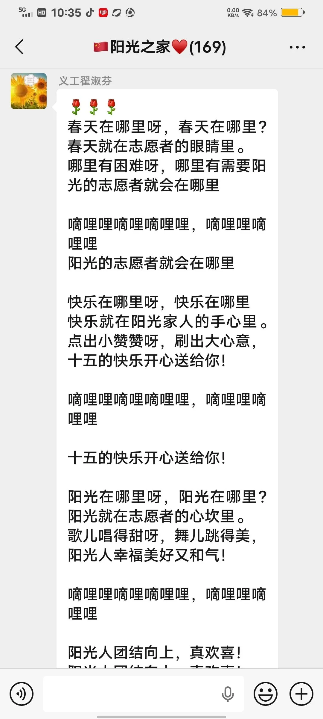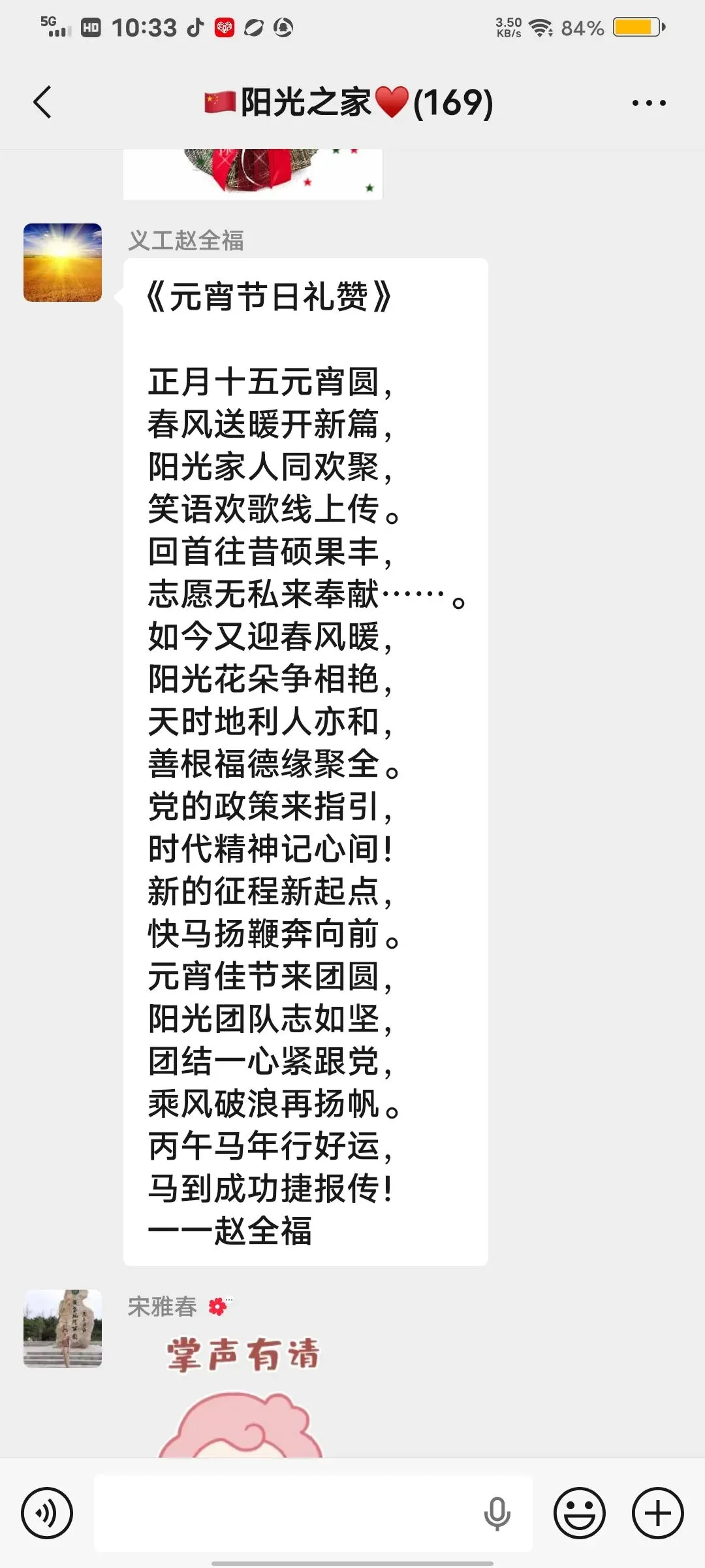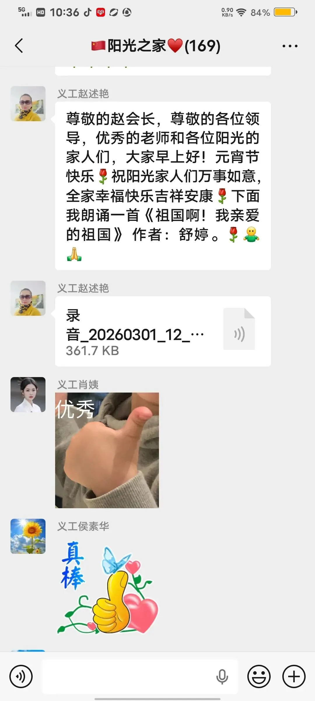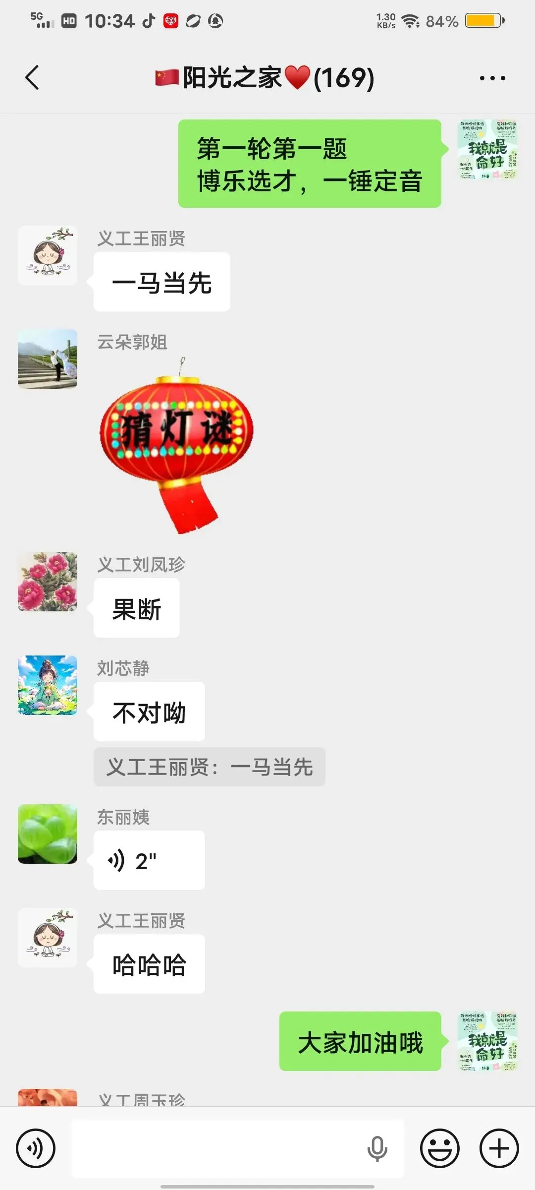 活动现场暖意融融、精彩纷呈。阳光文艺部提前拍摄的歌舞“卖汤圆”首先登场,把大家带入餐桌,共享那一碗碗热气腾腾、皮薄馅丰、软糯香甜的汤圆;诗朗诵《心在何方,世界便在何方》让大家体会到一切事物为心所现,心在哪里,世界就在那里;独白《正月十五传统习俗与发展》,让大家进一步了解“元宵节”的习俗,即承载着中华民族的历史记忆和文化传承,更焕发着新时代的发展之最;平剧《花为媒》《刘巧儿》精彩唱段,吸引大家对古代婚姻的认知;快板《正月十五闹元宵》,体现了元宵节全民共享“闹”的核心;诗朗诵《元宵节礼赞》、三句半《元宵节赞阳光》和歌曲《春天在哪里》,把阳光志愿者爱党、爱国、爱民、爱集体聚焦在节日的晨曦里,共享节日美好时光!掌声不断,节目不断,小朋友手势舞《马上好起来》、诗朗诵《正月十五闹元宵》、毛主席诗词《七律长征》,稚嫩的童声活力四射!诗朗诵《祖国啊!亲爱的祖国》,独唱《我的祝福你听到了吗》、《故乡的云》《英雄战歌》《明天会更好》《月亮代表我的心》;广场舞《正月十五闹元宵》,扇子舞《中华龙舞起来》一个个表演各具特色,赢得大家点赞喝彩。趣味盎然的“猜谜”环节,大家积极互动,在动脑解谜中感受传统民俗的独特魅力!
