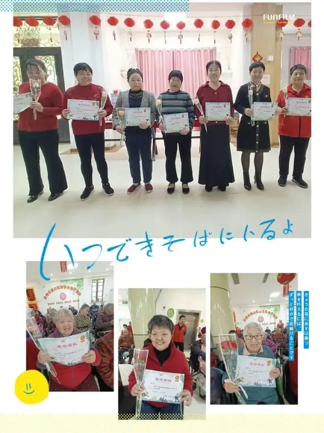 我们还准备了荣誉表彰:为平时心态好、爱参与活动的阿姨们颁奖!“爱心天使”奖,表彰平时辛苦照顾老人的女性护理员,让她们也感受到被关怀,被尊重!