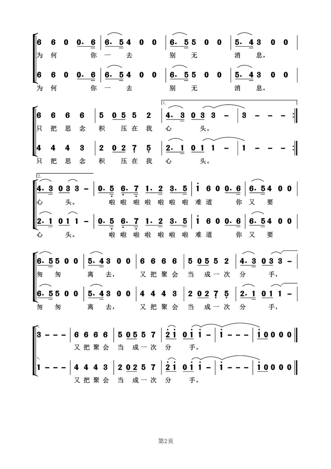 歌词以“你从哪里来,我的朋友”开头,反复吟唱中强化思念主题。主要段落描写友人匆匆相聚又别离的情景,结尾“又把聚会当成一次分手”表达了对离别无奈的感慨。