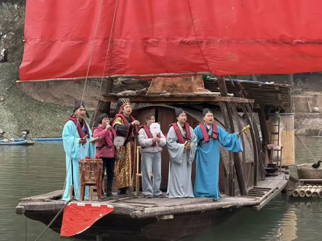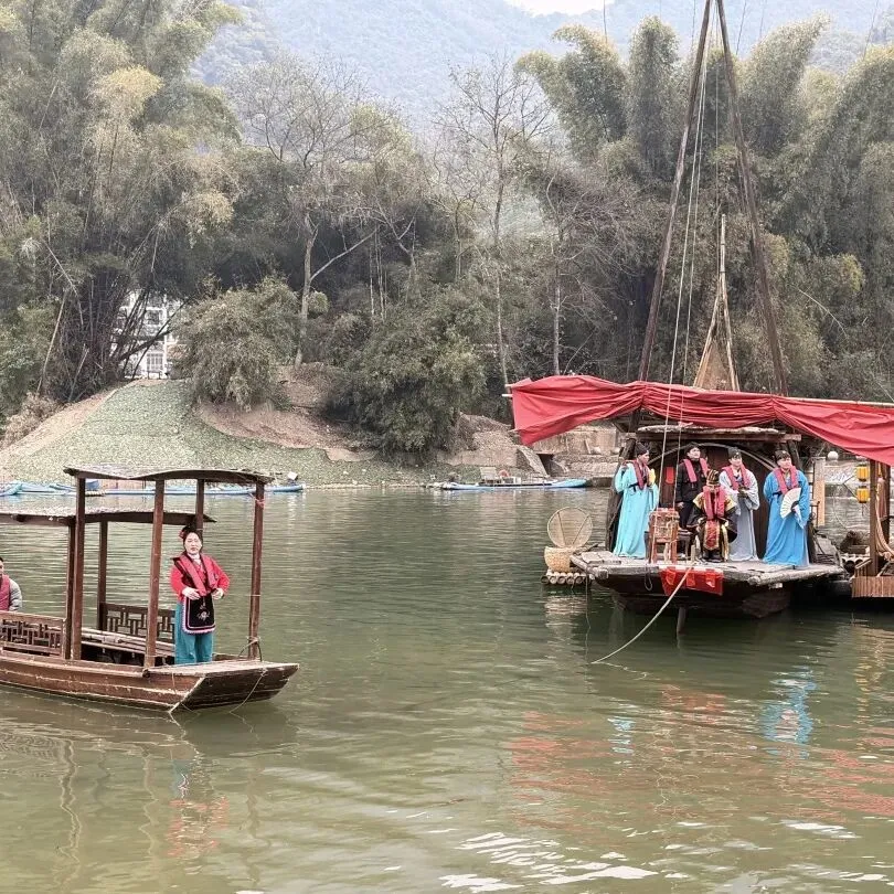 漓江作为闻名中外的电影《刘三姐》外景拍摄地,山清水秀间竹影婆娑,既藏着桂林山水的灵秀,更镌刻着壮族民间传说的深厚印记,曾见证刘三姐以歌为剑、洒脱聪慧的动人模样。如今,这段经典在兴坪码头渔村游实景复刻,专业NPC精准还原刘三姐与莫老爷的鲜活形象,将传说中的智斗名场面娓娓道来,更创新性融入漓江上承载千年水运智慧的红帆船——一桅一帆的古朴形制尽显古人匠心,褪去运输功能的它,成为这场互动表演的专属舞台,让自然山水与人文底蕴完美交融。