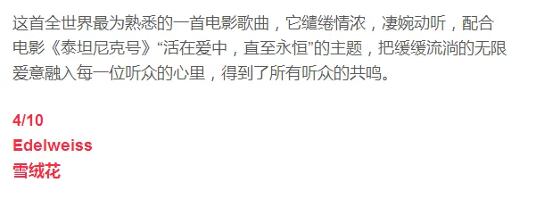 《Edelweiss》是《 音乐之声》中的插曲。在影片中,上校一家参加为德国军官举行的音乐会,他们决定当夜离开奥地利,前往瑞士。音乐会上,上校弹起吉他,唱起了这首奥地利民歌,之后哽咽地唱不下去了, 玛利亚和孩子们走上去与他一起唱,他们的深情感动了在场的奥地利观众,在上校的示意下奥地利观众都激动地与他们合唱了起来。这首歌曲流传甚广,深受中国人民喜爱。