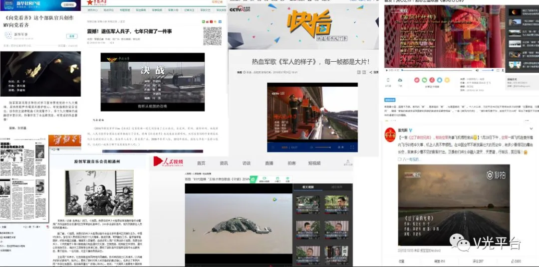 中国V光曾创作推出全军战斗精神队列歌曲《当兵就是那么帅》;寻访英雄主题歌《记得》;全网置顶头条作品《信仰的味道》;全国传唱红色经典歌曲《向党看齐》;全国推广的家风主题歌《家风代代传》;中央军委政治工作部推出的致敬时代楷模主题歌《守望》;全军开训主题歌《决战》;东部战区利剑联合演习主题歌《利剑出鞘》等。