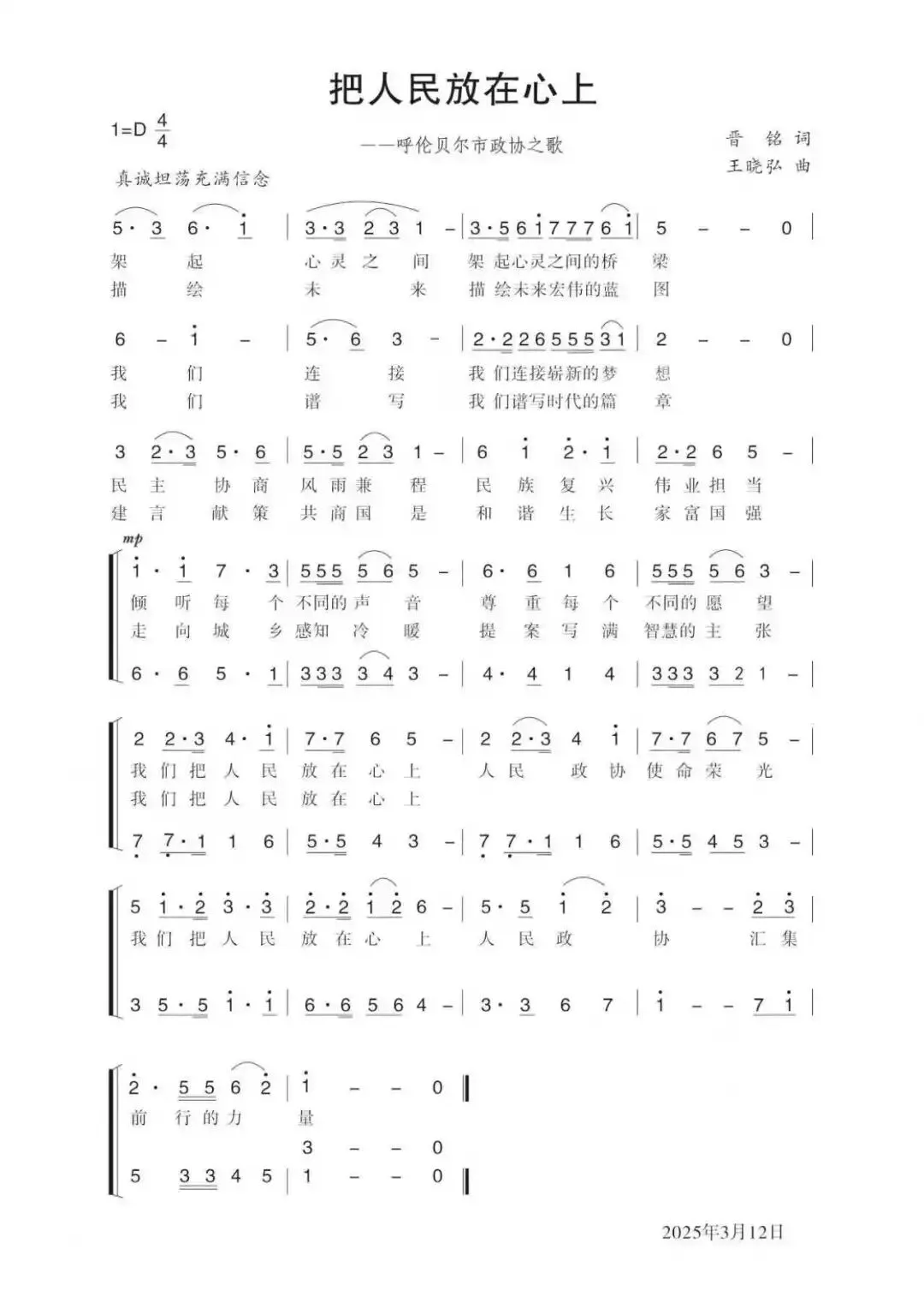 《把人民放在心上》由晋铭作词、王晓弘作曲,是一首紧扣人民政协使命、彰显以人民为中心理念的新时代主旋律佳作,词情与曲韵相融,初心与担当同频。