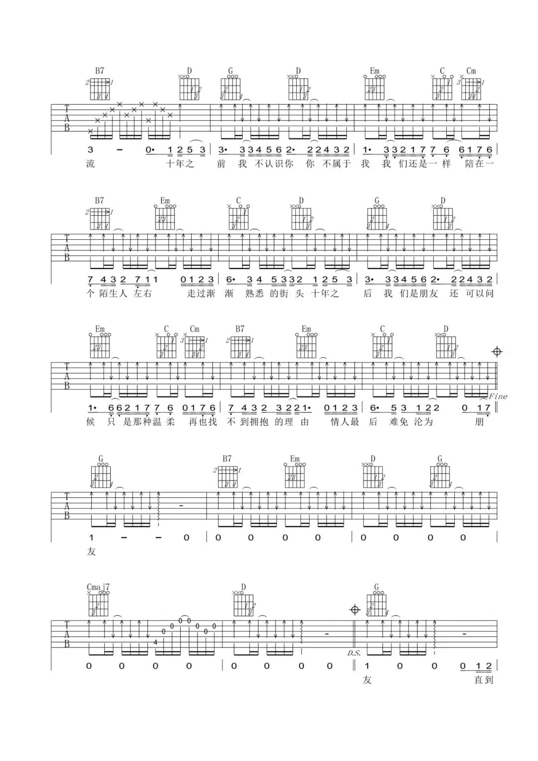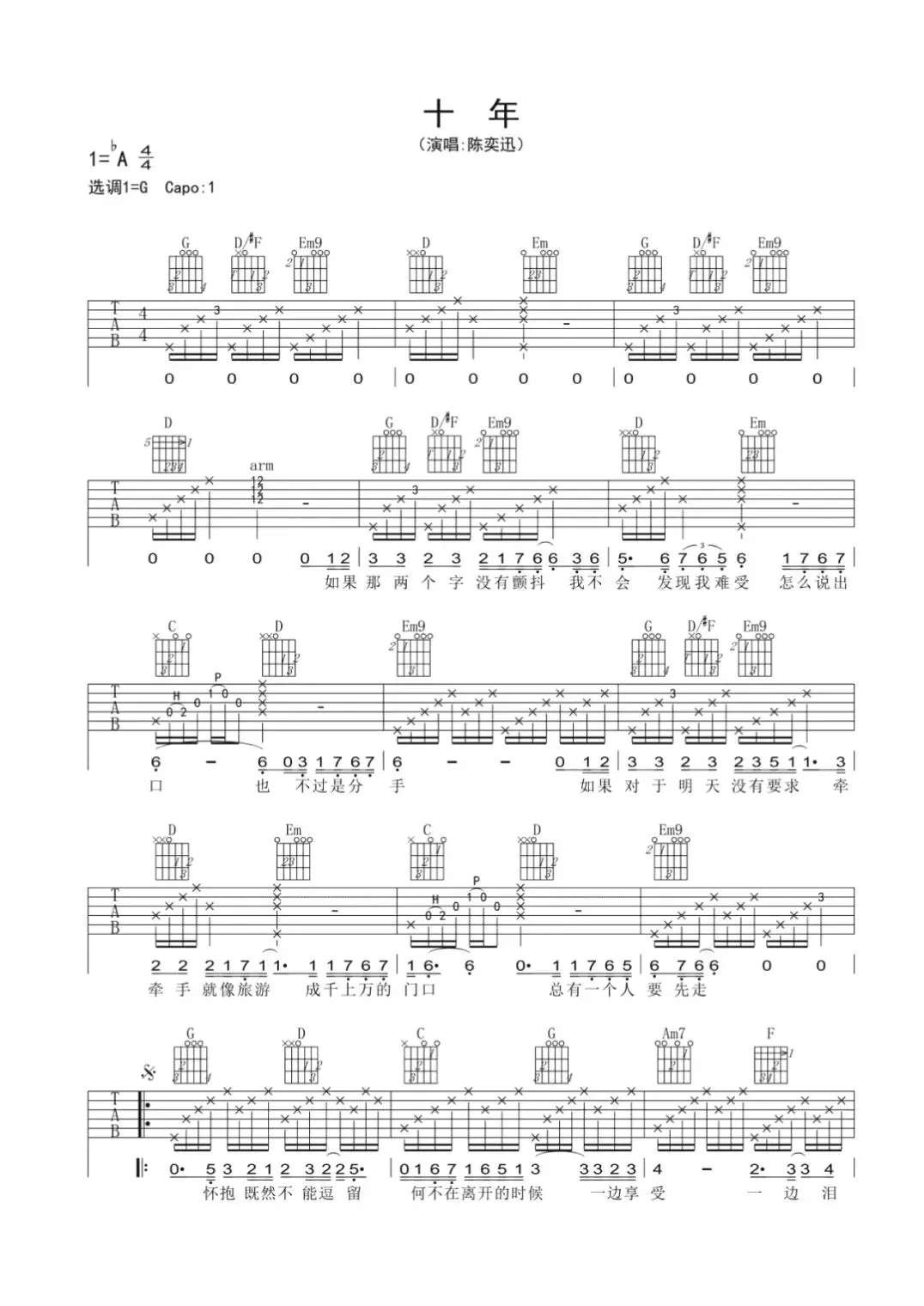 《十年》是陈奕迅国语市场的里程碑作品,2003年发行。歌词用“十年之后,我们是朋友”直白写出爱情消逝后的无奈,没有复杂修饰,却精准戳中很多人的情感经历。旋律简单但情感厚重,适合吉他初学者练习,用基础分解和弦就能弹出完整感觉,适合安静时自弹自唱。