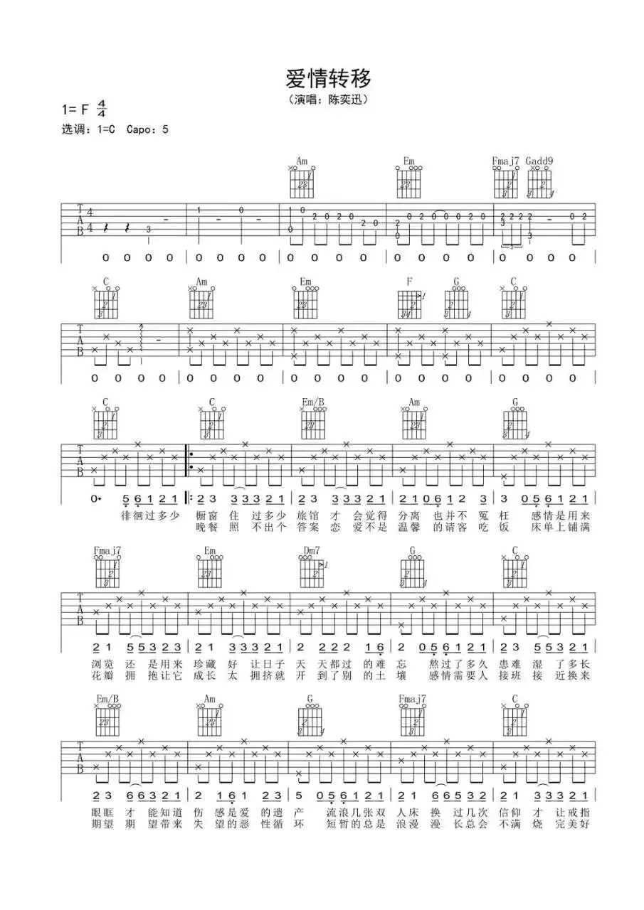 《爱情转移》是《富士山下》的普通话版,2007年为电影《爱情呼叫转移》创作。林夕重新填写的歌词探讨爱情中的“流动与替代”,旋律优美又带点哲学感,成为内地传唱度很高的陈奕迅国语歌。它的吉他编配注重情绪传递,适合用温柔的分解和弦表现,能让人静下心来感受歌词里的爱情无常论。