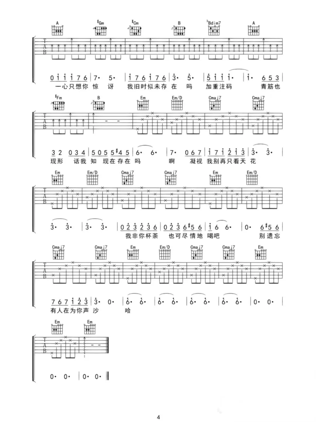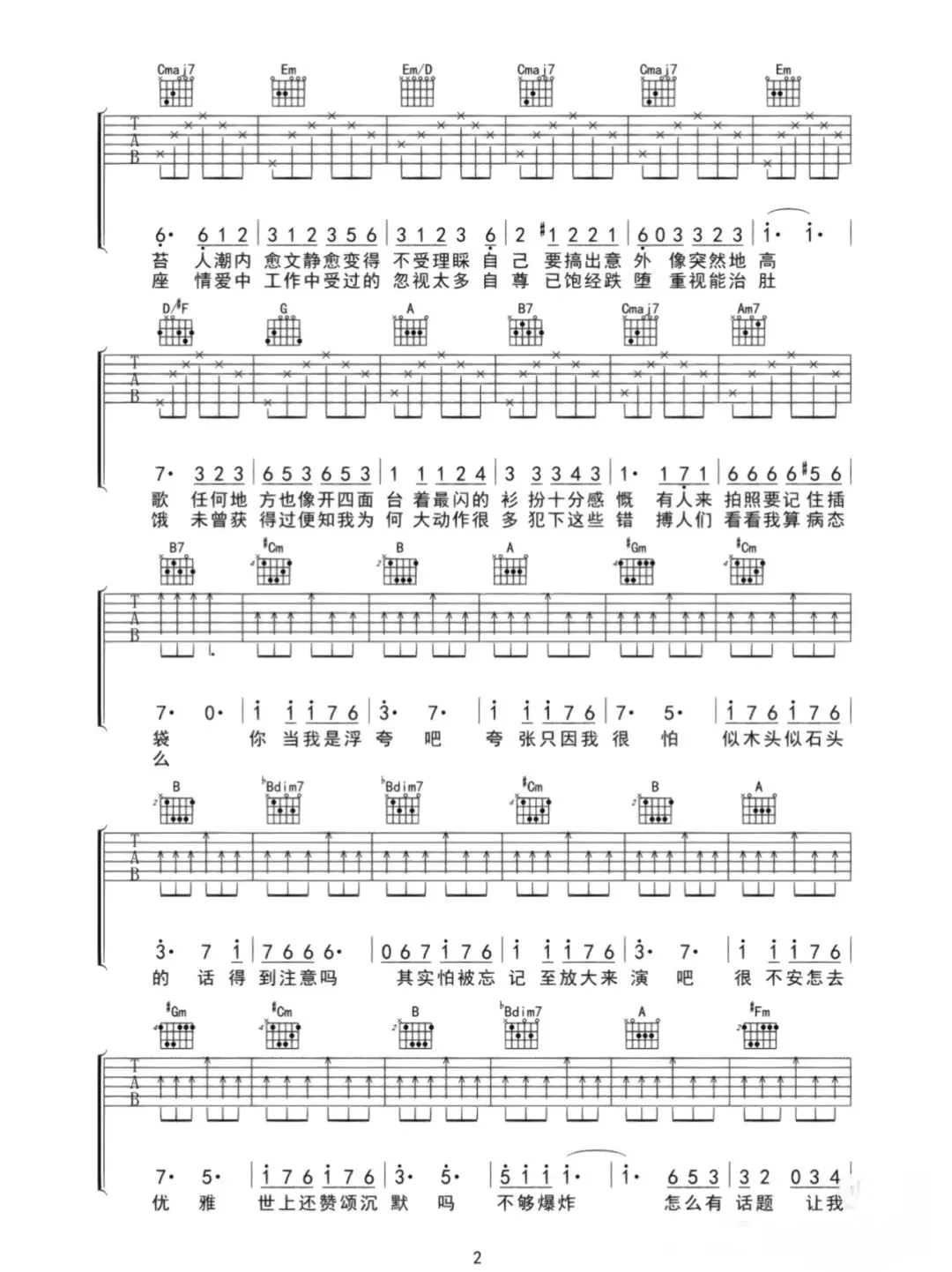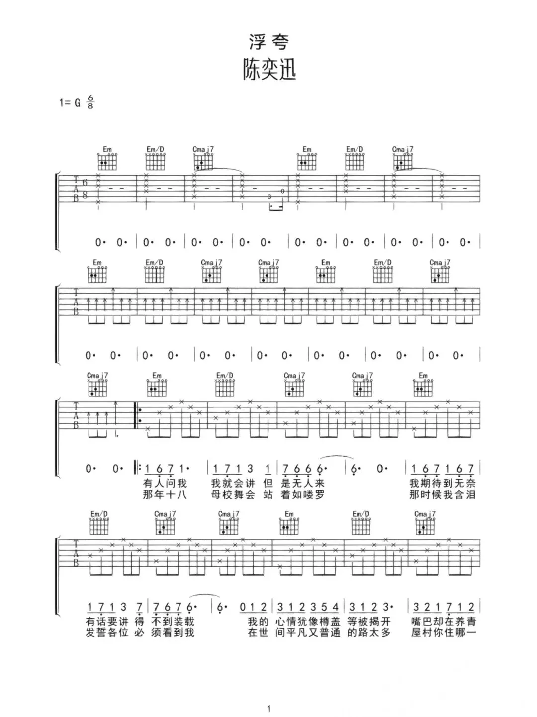 《浮夸》2005年发行,是陈奕迅极具代表性的粤语作品。歌词讲小人物在人群中的压抑与呐喊,道尽被忽视的落寞,副歌的呐喊式演唱充满张力。它的吉他编配层次丰富,主歌用低沉的分解和弦,副歌可以用扫弦增强情绪,适合进阶练习,能锻炼力度控制和情感表达。